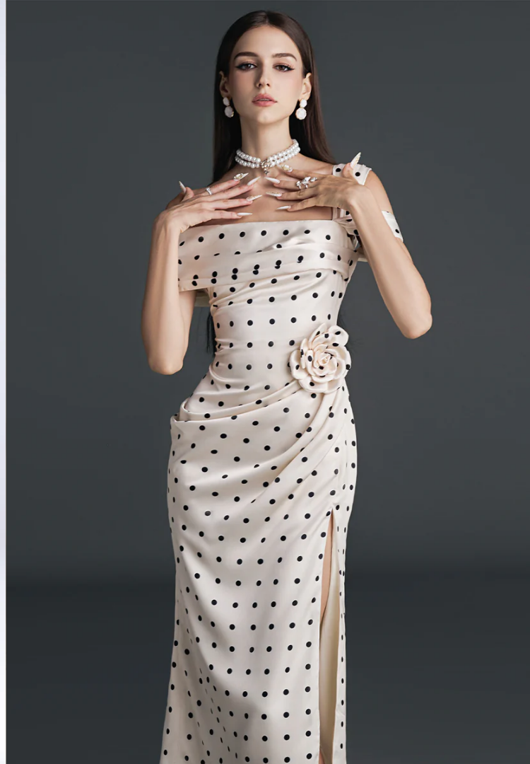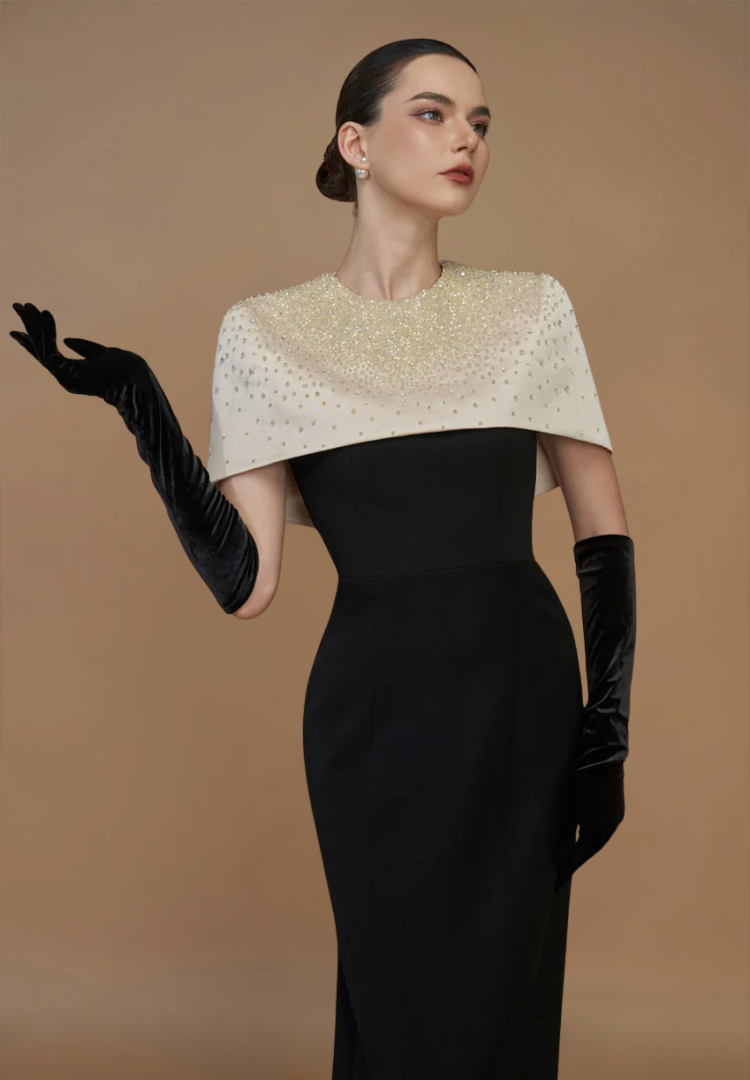 A modern take on vintage allure, blending playful detail with sculpted femininity in effortless sophistication.