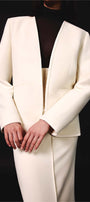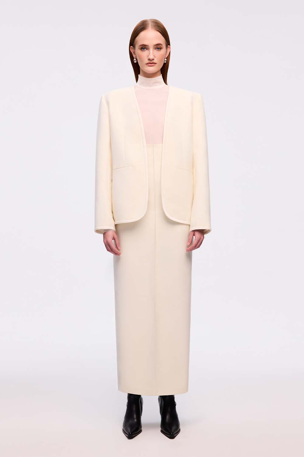 The blazer offers a straight-structured silhouette, characterized by its clean lines, no lapels and shoulders slightly wider than the natural body form. This design choice makes it fit numerous different body types, providing a relaxed and refined fit, ideal for layering over other garments.