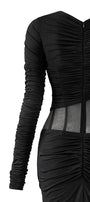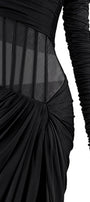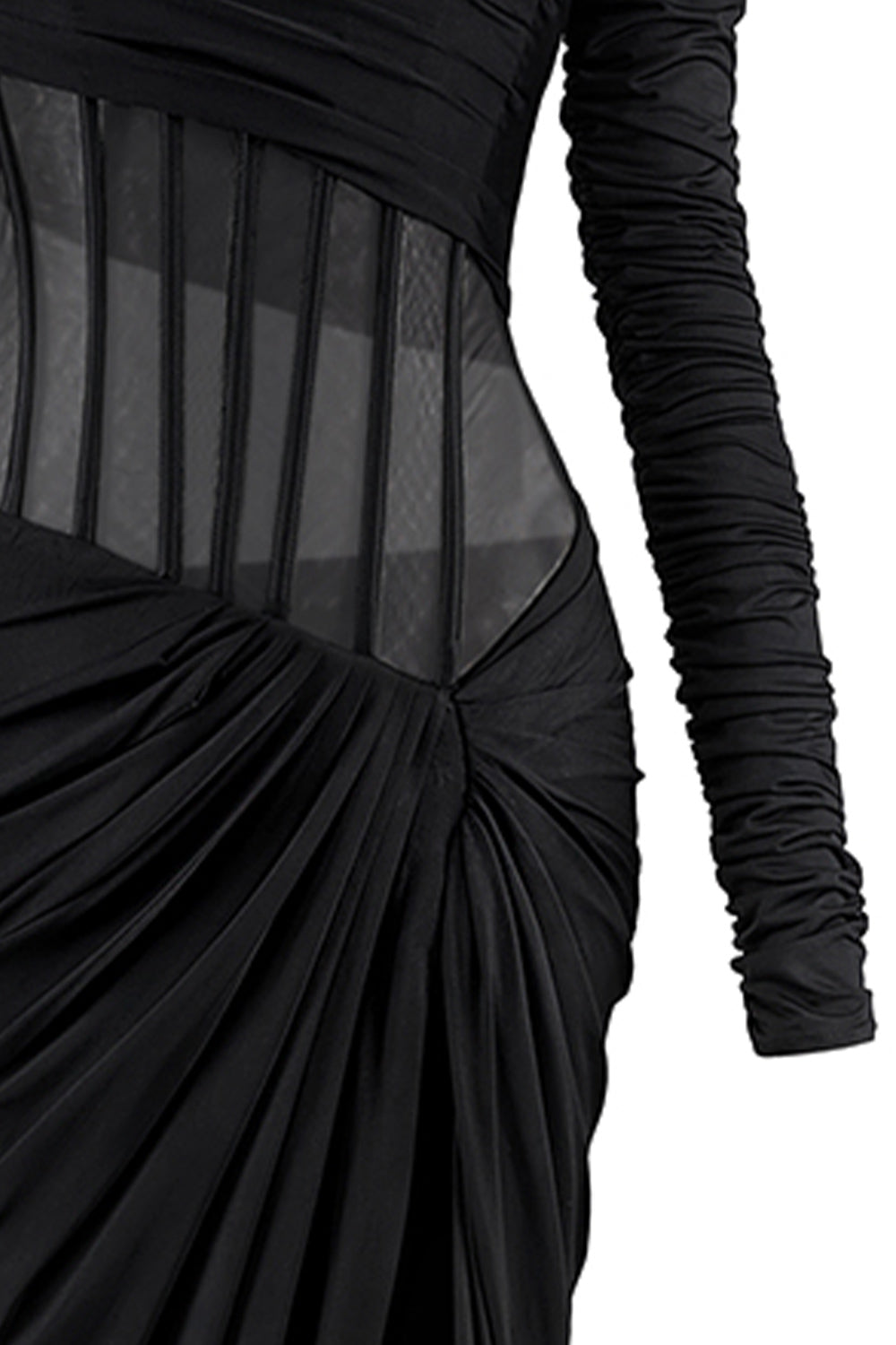 See-through corset waist with boning, Asymmetric draped slit skirt, Diagonal neck with gathered detail, Back zipper with gathered detail