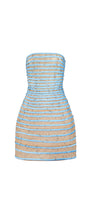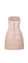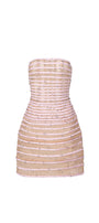 This mini dress features a straight-across neckline and delicate chiffon fabric adorned with horizontal striped lines. Attached beads add subtle texture and elegance, making it a refined choice for stylish occasions. The lightweight chiffon ensures comfortable wear while the A-line silhouette flatters a variety of body shapes.