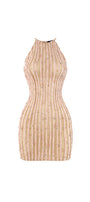 The mini dress features a sleek bodycon silhouette enhanced by elegant striped lines that contour the figure. The bodice is intricately adorned with a mix of beads, adding a refined texture and subtle shimmer. Crafted with a halter neck design, this dress offers a sophisticated yet modern look perfect for evening events or upscale gatherings. Its mesh fabric ensures breathability while maintaining a flattering fit.