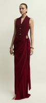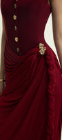 This expert-crafted sheath maxi dress features a refined V-neck, elegant draping, and gathering on luxurious crepe. Enhanced with button, metal, and braid embellishments, it ensures a sophisticated silhouette. Perfect for formal events, cocktail parties, or upscale gatherings.