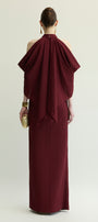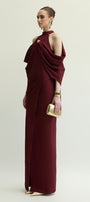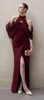 Experience refined elegance in our sheath maxi dress, crafted from luxurious crepe. The draped silhouette, halter neckline, and metallic accents create a sophisticated look. Perfect for evening events, cocktail parties, and upscale gatherings.
