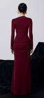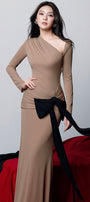 Elevate your style with this sophisticated sheath maxi dress. Featuring an elegant asymmetric neck, regular sleeves, delicate gathering, and ribbon embellishment on luxurious spandex, it's ideal for formal events, cocktail parties, and elegant evening occasions.