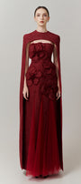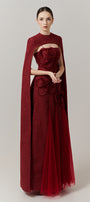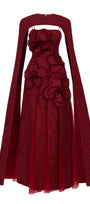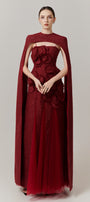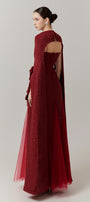 Elevate your style with this expert-crafted A-line maxi dress, featuring premium tweed, appliqué embellishments, a classic round neck, and elegant cape sleeves. Ideal for formal events, evening gatherings, or special celebrations.