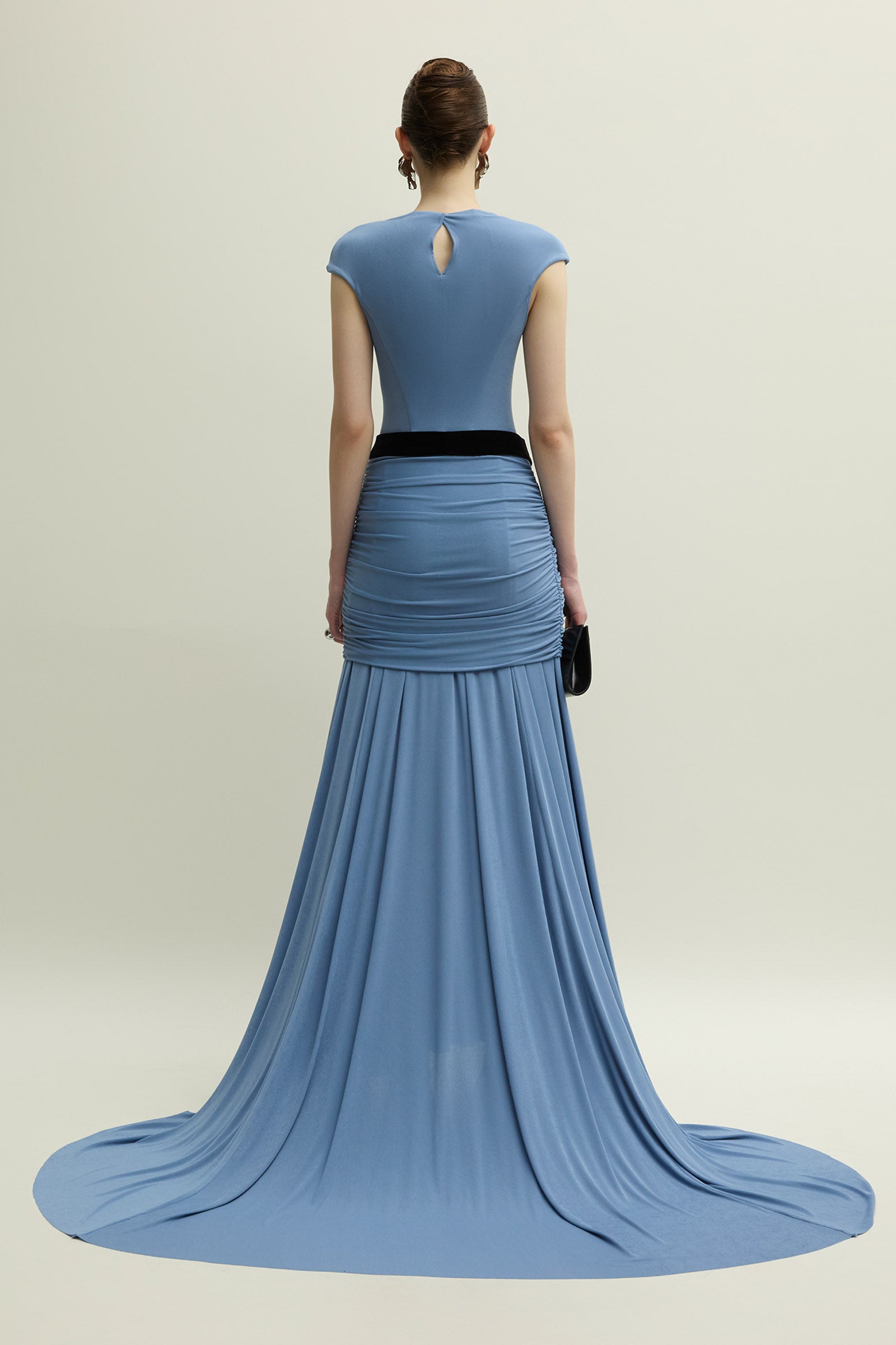 Crafted from luxurious jersey, this sheath maxi dress features a chic cowl neck, regular sleeves, and artful gathering for an elegant silhouette. Perfect for evening events, weddings, and sophisticated gatherings where style and comfort are paramount.