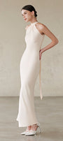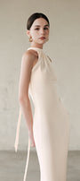 Expertly crafted from luxurious silk, this sheath maxi dress features a halter neck and elegant gathering detail for a figure-flattering look. Ideal for formal events, evening galas, or sophisticated cocktail parties.