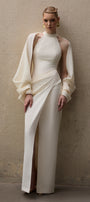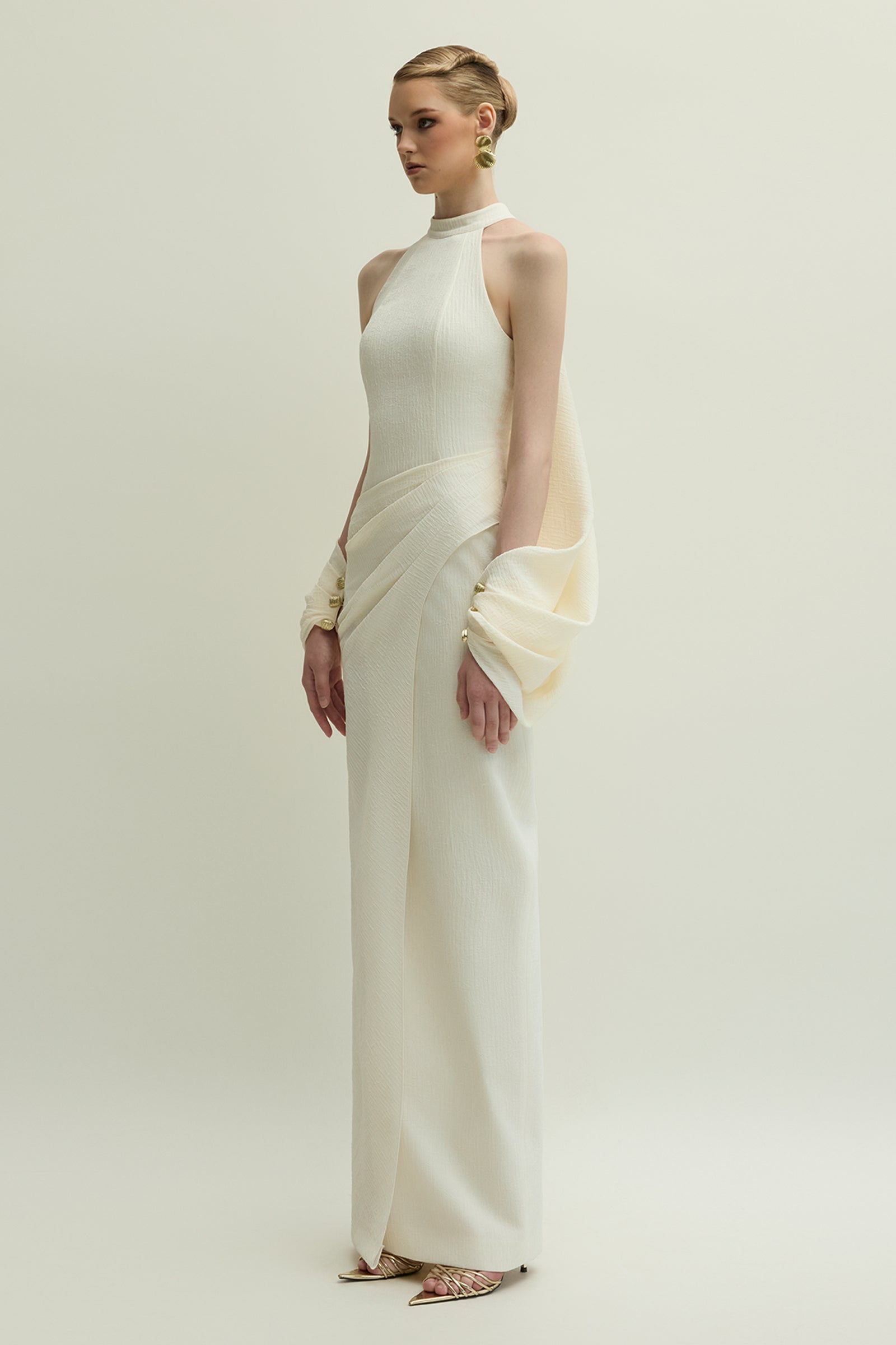 Expertly crafted from crepe, this sheath maxi dress features a sophisticated halter neckline, elegant cape sleeves, and refined draped detailing. Perfect for formal events, evening soirées, and upscale parties.