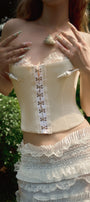 Straight across neck with lace trimming, Corset with boning, Attached brooch on the side