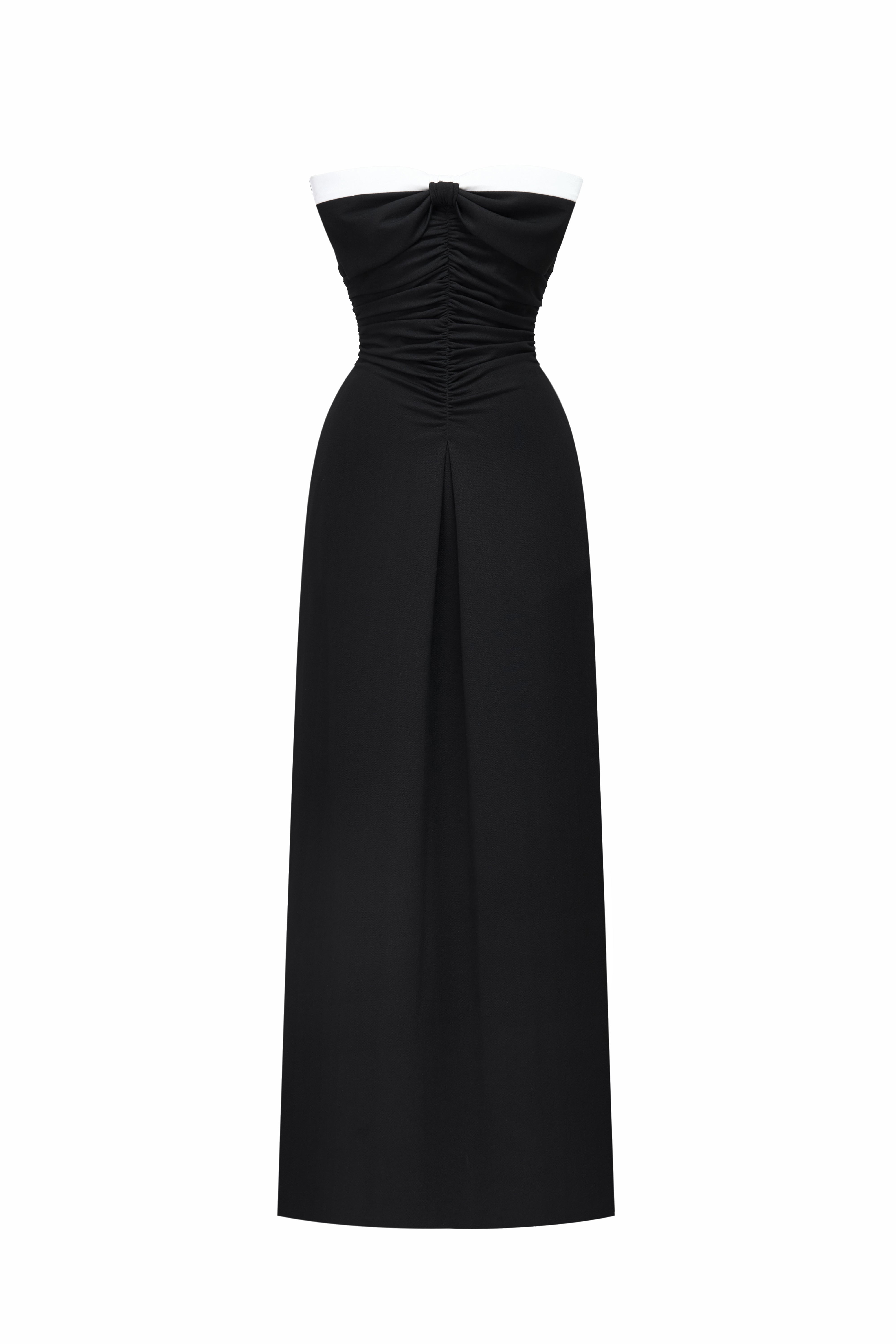Stylized bow sweetheart neck at the chest, Ruched at the upper waist, Crease at the front