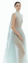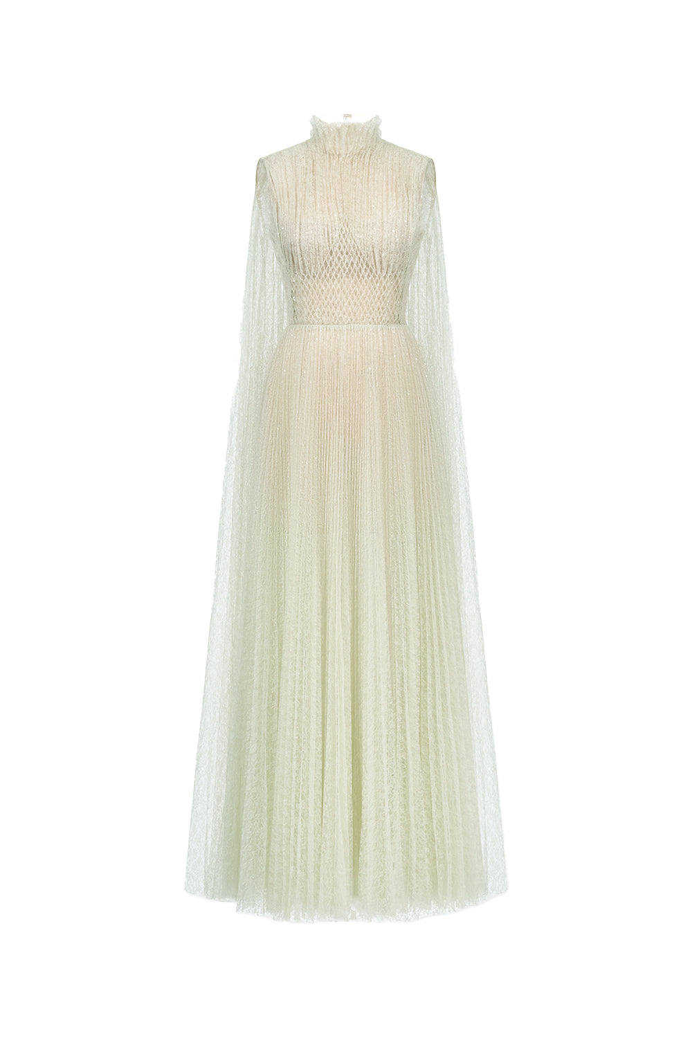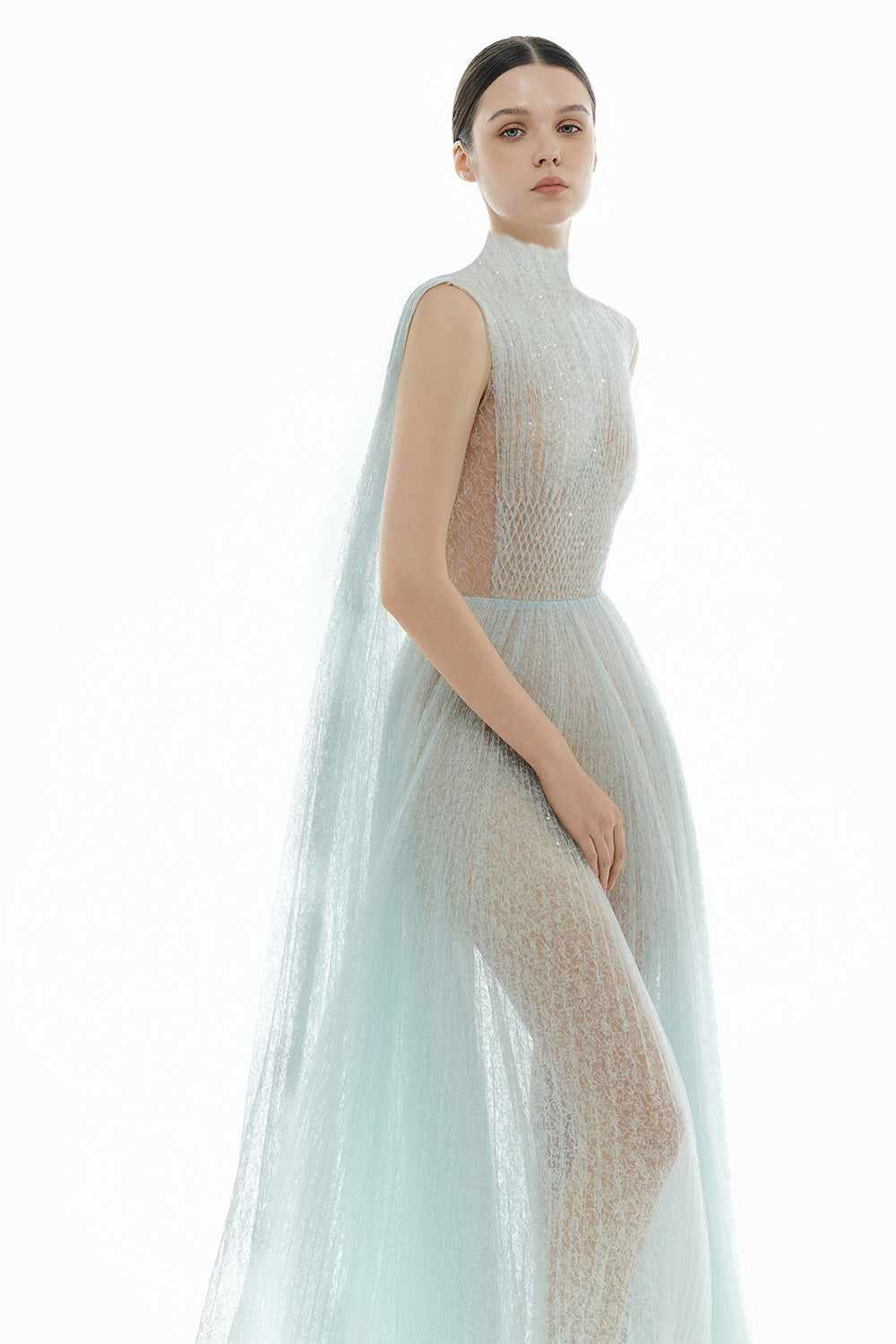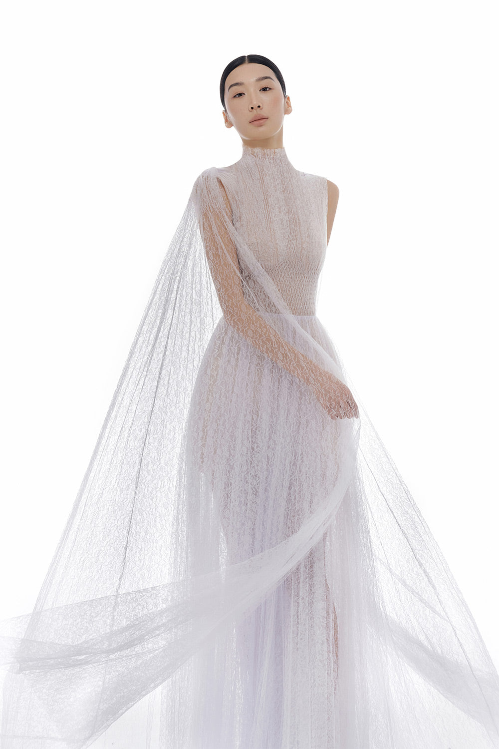 This elegant dress features a gathered design and sheer fabric, creating a flowy and flattering silhouette. The smocked waistline provides a comfortable and adjustable fit, perfect for any body type. Made with high-quality lace, this dress is both stylish and comfortable for any occasion.