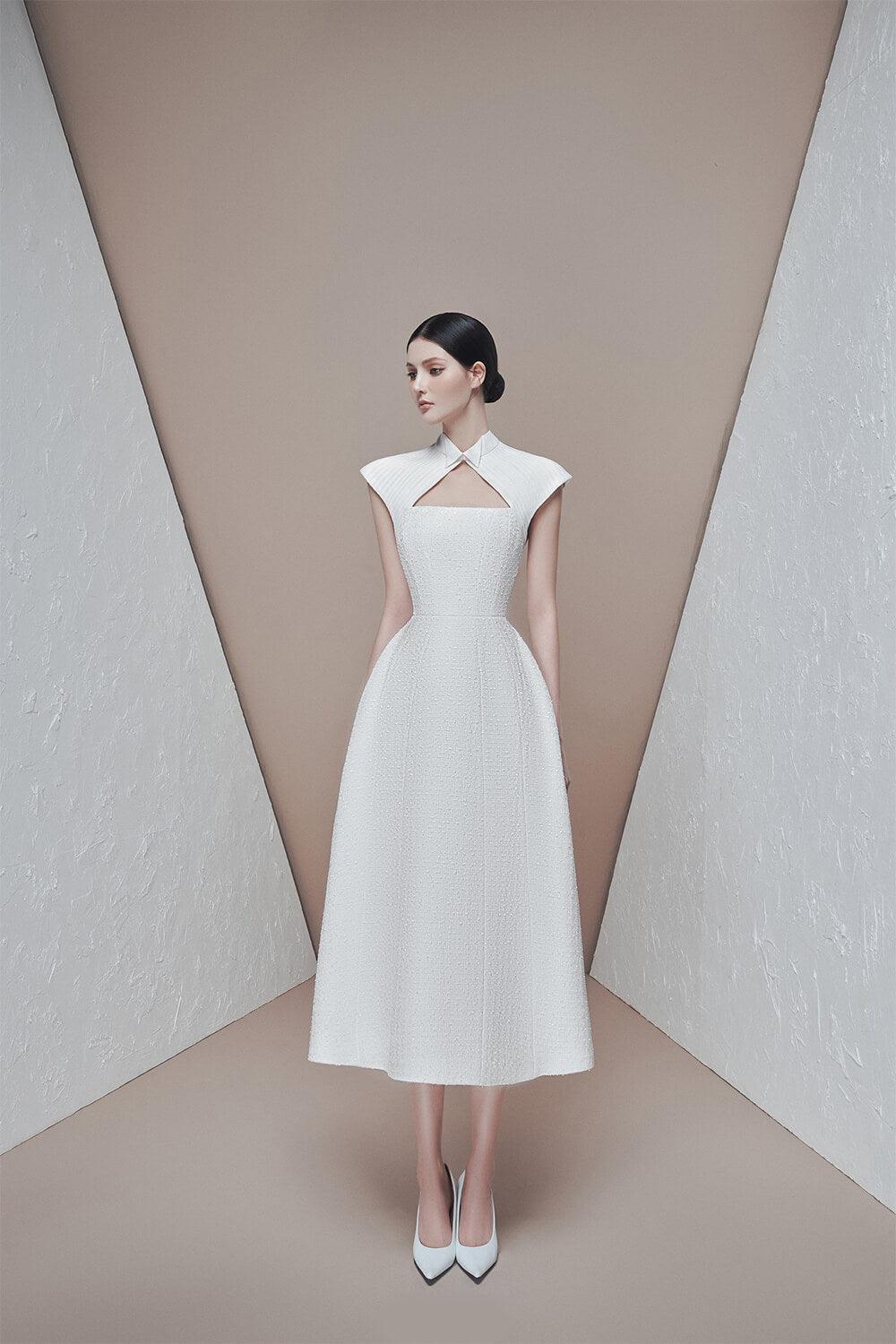 تصميم ذو تأثير كلاسيكي لا يزال ينضح بأناقة وأنوثة من يرتديه. اللون الأبيض النقي مع مزيج متناغم من المواد يجعل الزي أكثر فخامة وبريقا.