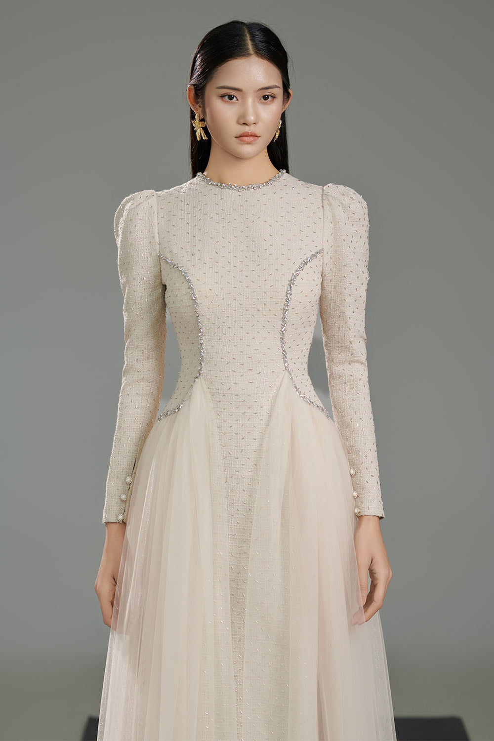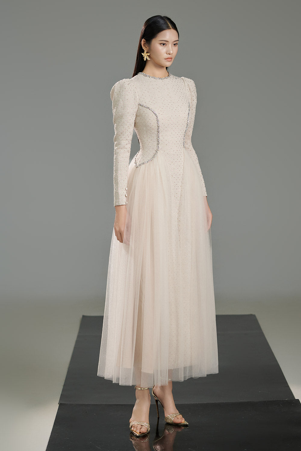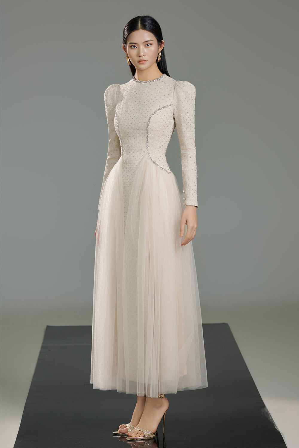This dress is crafted from high-quality polyester, ensuring a durable and lightweight garment. The A-line silhouette and puffy sleeves add a touch of elegance and femininity. Its ankle-length design offers a versatile look, perfect for any occasion. Upgrade your wardrobe with this must-have dress.