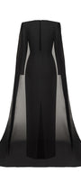 Special Features: Undetachable sheer cape, High slit back, Waist dart, Square shoulder