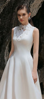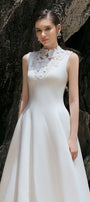 Diagonal seam along the dress, Attached floral with mesh on V-neck, Wavy hem, Waist dart