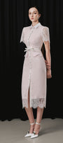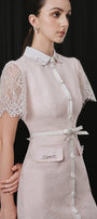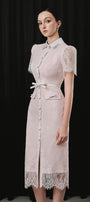 Expertly crafted with a mix of white buttons, a delicate bow, and a belt, the dress is perfect for any formal occasion. The intricate lace design adds a touch of elegance, while the collared neck and midi length give a sophisticated look.