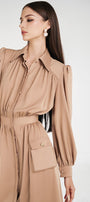 Elevate your wardrobe with the dress. Crafted with an A-line silhouette and puffy sleeves, this dress exudes elegance and sophistication. The luxurious silk fabric adds a touch of opulence, making it perfect for any special occasion. Own the room with this stunning and timeless dress.