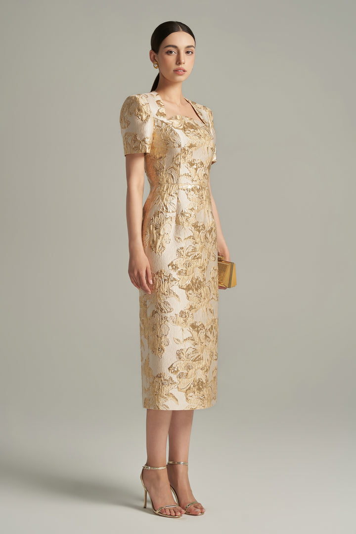 Adriana Sheath Queen Anne Neck Lace Brocade Length Dress