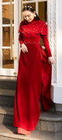 إن أخذ درجات اللون الأحمر كلون رئيسي مع القماش المخملي عالي الجودة يخلق سحرًا فاخرًا لـ Ao Dai. أبرز ما يميز التصميم هو الكتف المتعرج والمطرز بالخرز والذي خلق تأثيرًا متألقًا ويجعل الزي أكثر جاذبية.