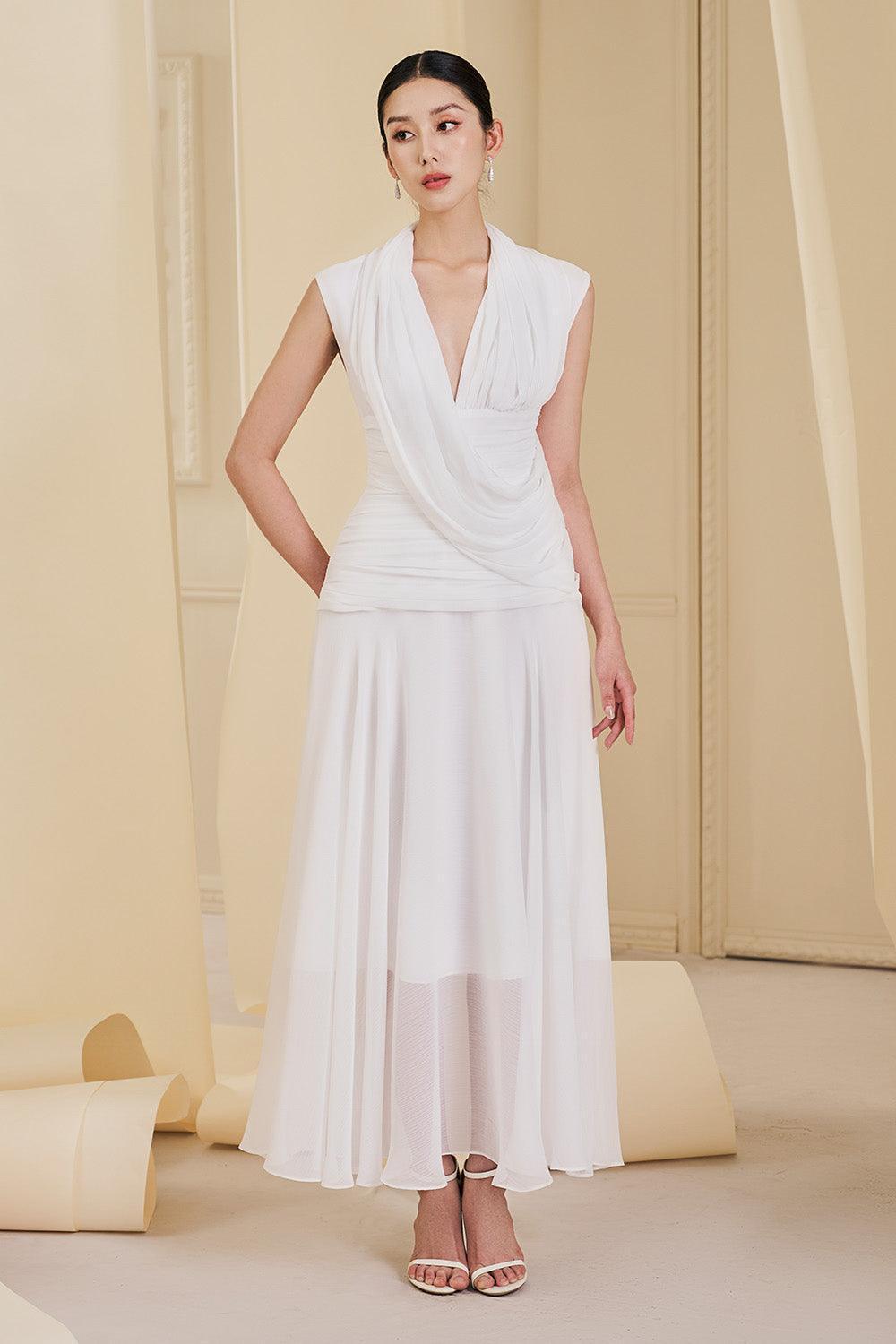 Aurelia Gathered V-Neck Tulle Ankle Length Dress