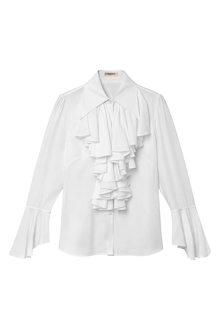 Special Features Pointed flat collar, Ruffle layer on the front, Flare poet sleeves, Cascade collar