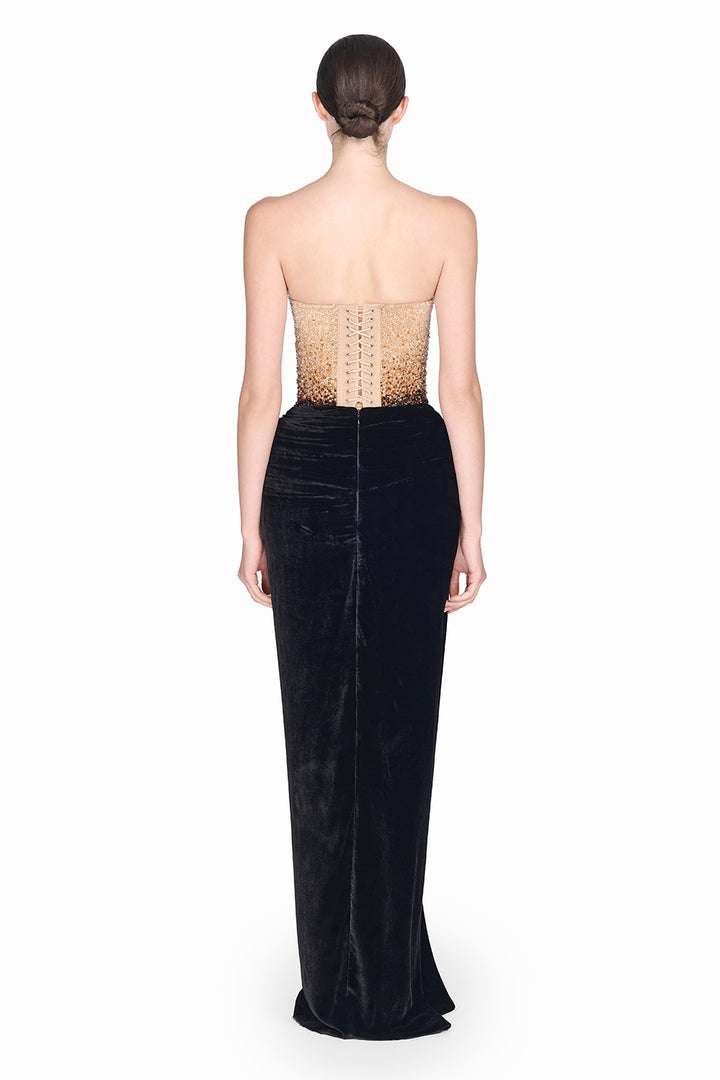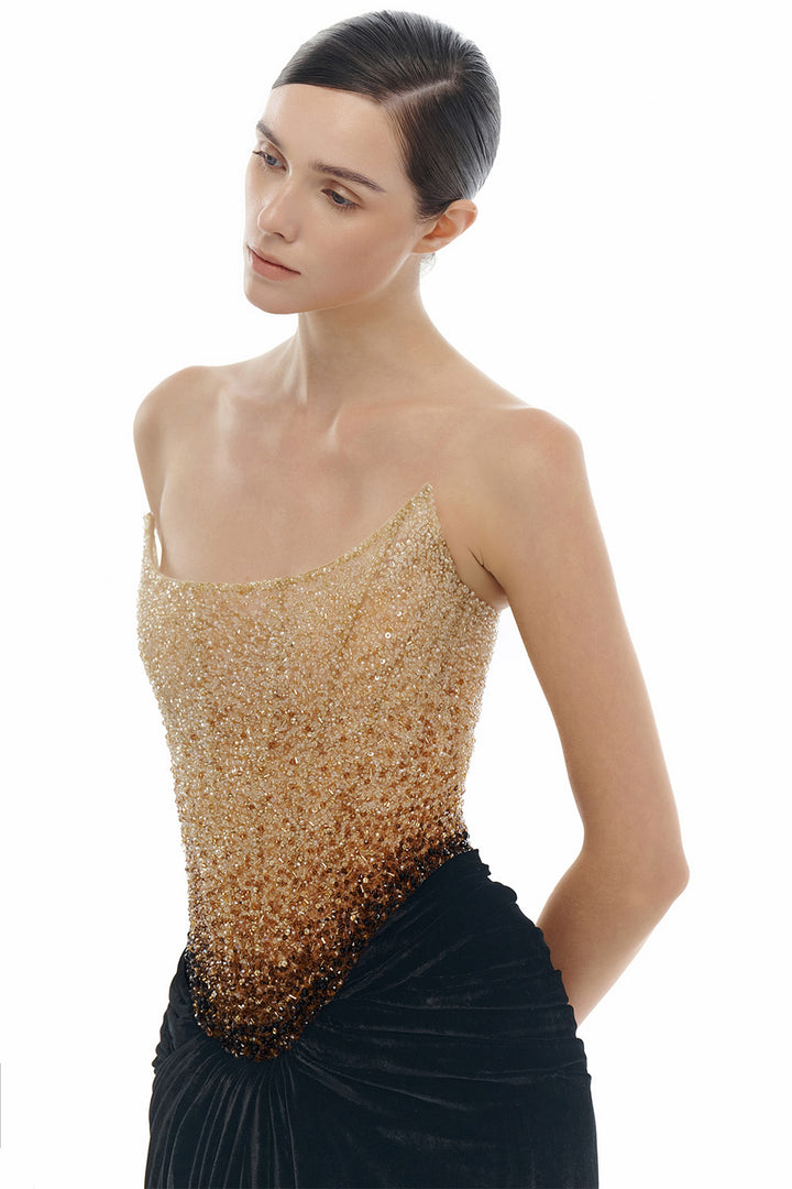| Special Features | Gradient effect top with beads and sequin, Crossover lacing at the back, Sarong design, Draped puffy hip, Front slit |