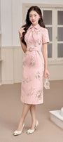 Dart line on both sides, Bird brocade pattern, Draped neck as cravat design, Matching belt fabric