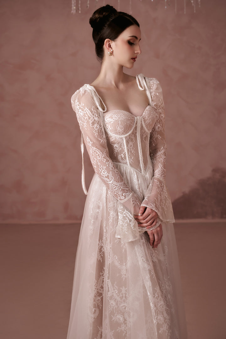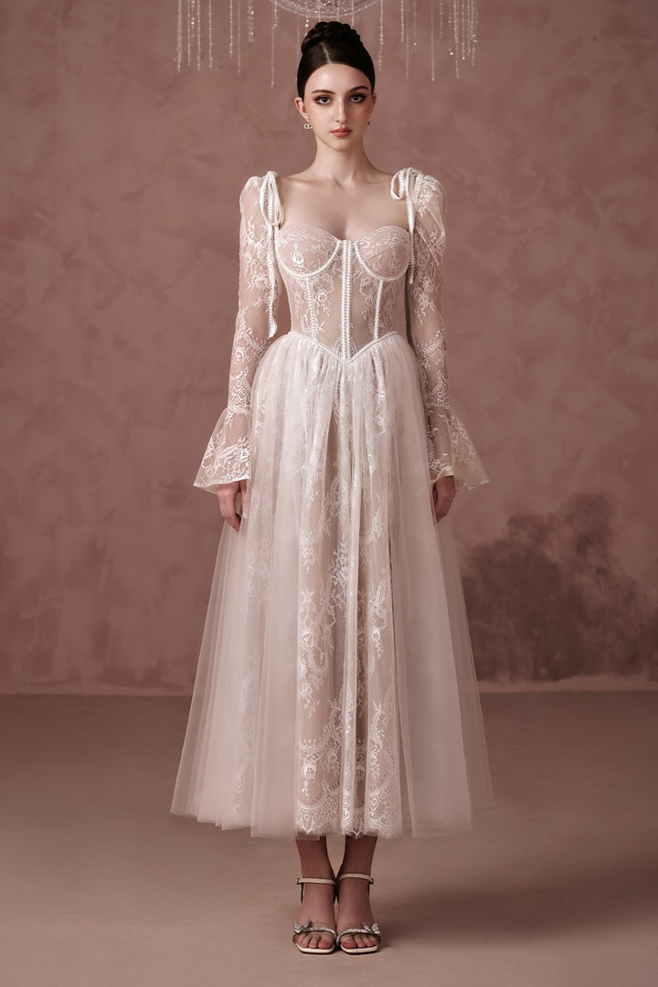 This dress features delicate poet sleeves and intricate silk lace, creating a timeless and elegant ankle length design. The luxurious materials and sophisticated silhouette make it perfect for any special occasion. Elevate your wardrobe with this effortlessly chic dress.