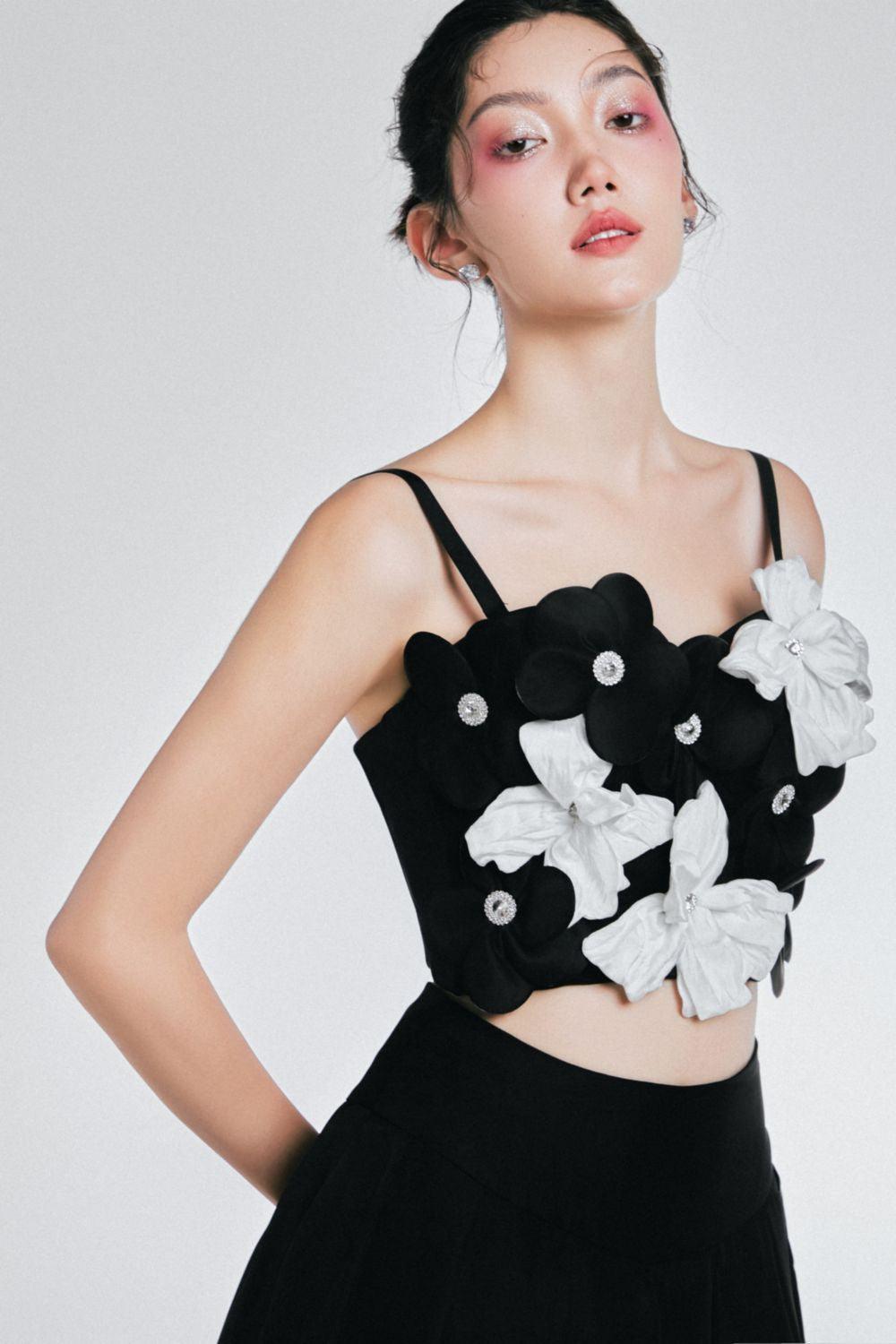 Special Features: زخارف زهور ثلاثية الأبعاد في الأعلى, ارتفاع الخصر, تنورة مطوية, خطافات وعيون في الجزء العلوي الخلفي