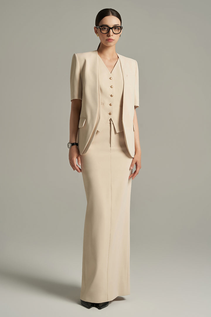 المواد: مخمل (سترة وردية/بوردو)، بوليستر (سترة رمادية)، كريب (سترة خضراء داكنة)، حرير (سترة عاجية)