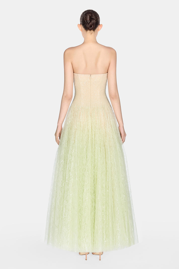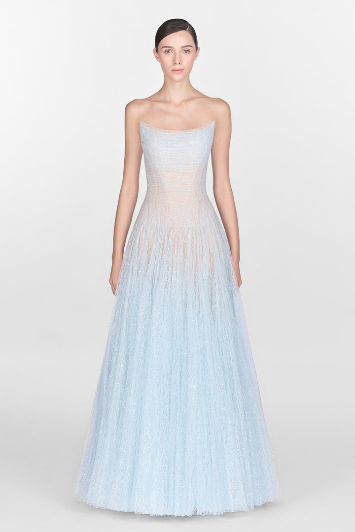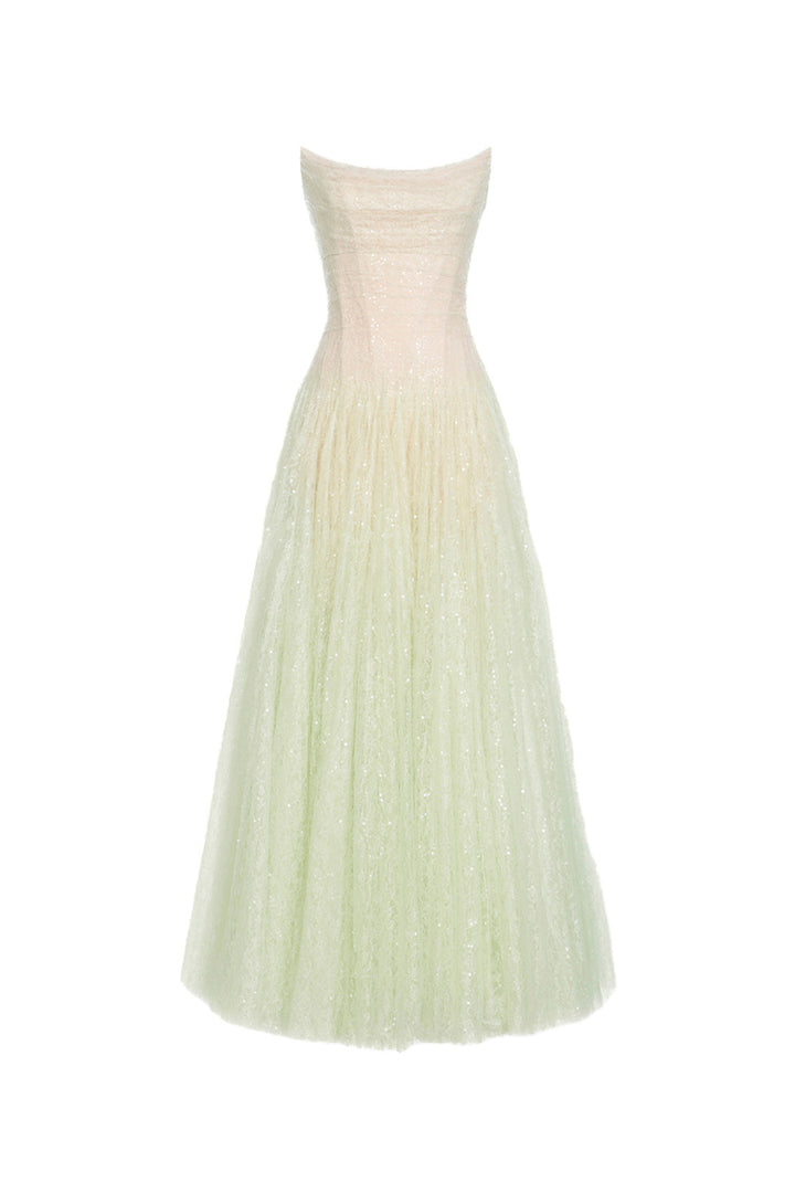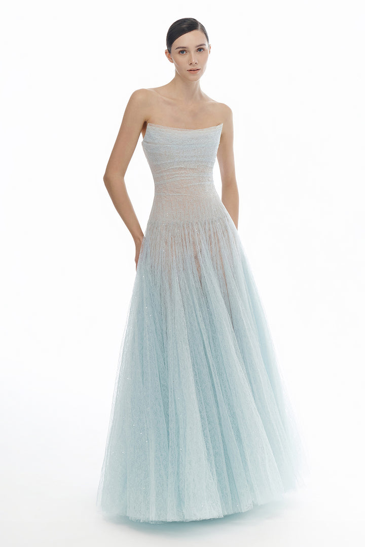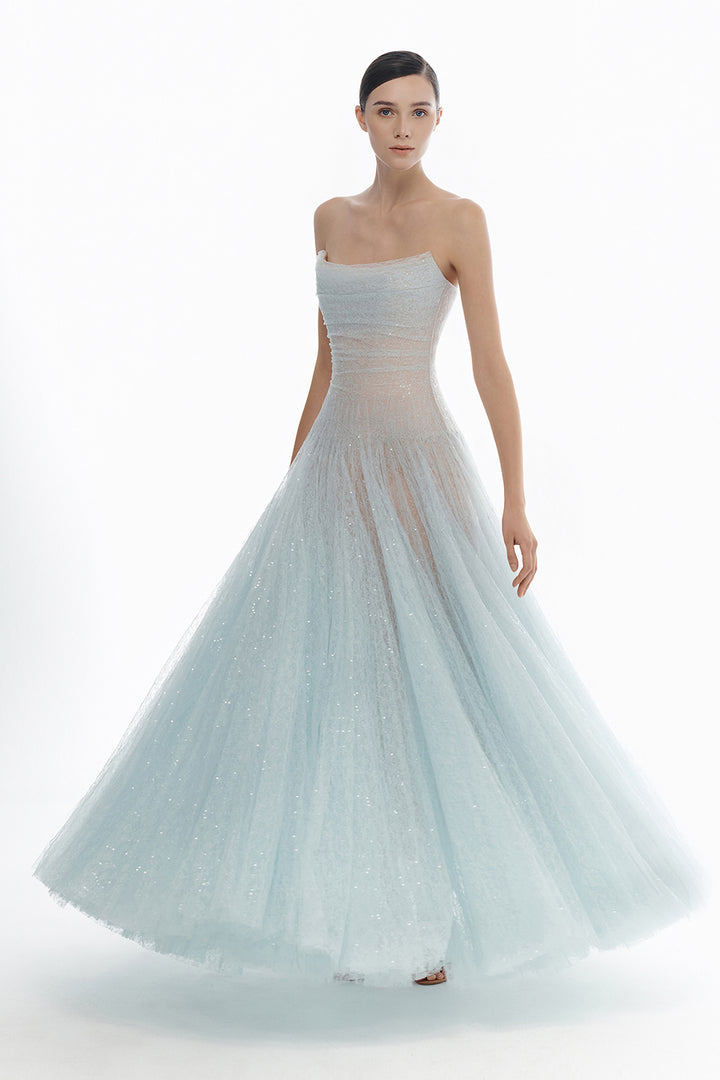 | Special Features | Strapless dress with corset waist design, Glitter effect with sequin, Gathered flare skirt, Hidden back zipper, Draped layer bodies |