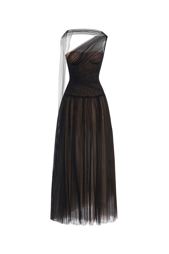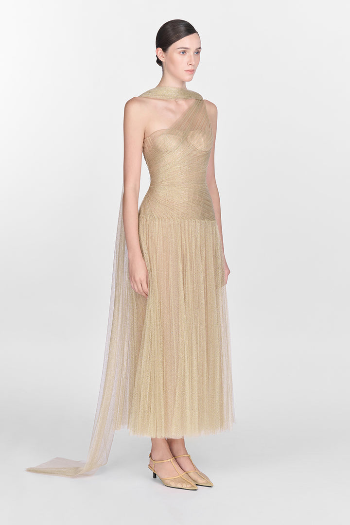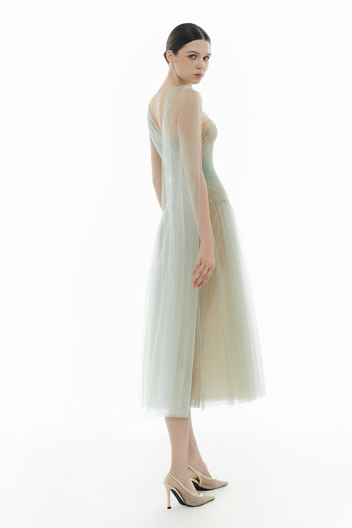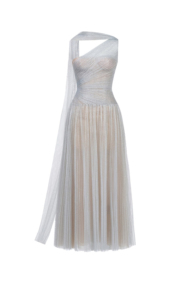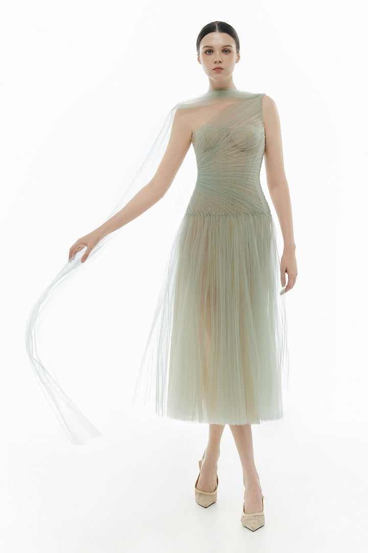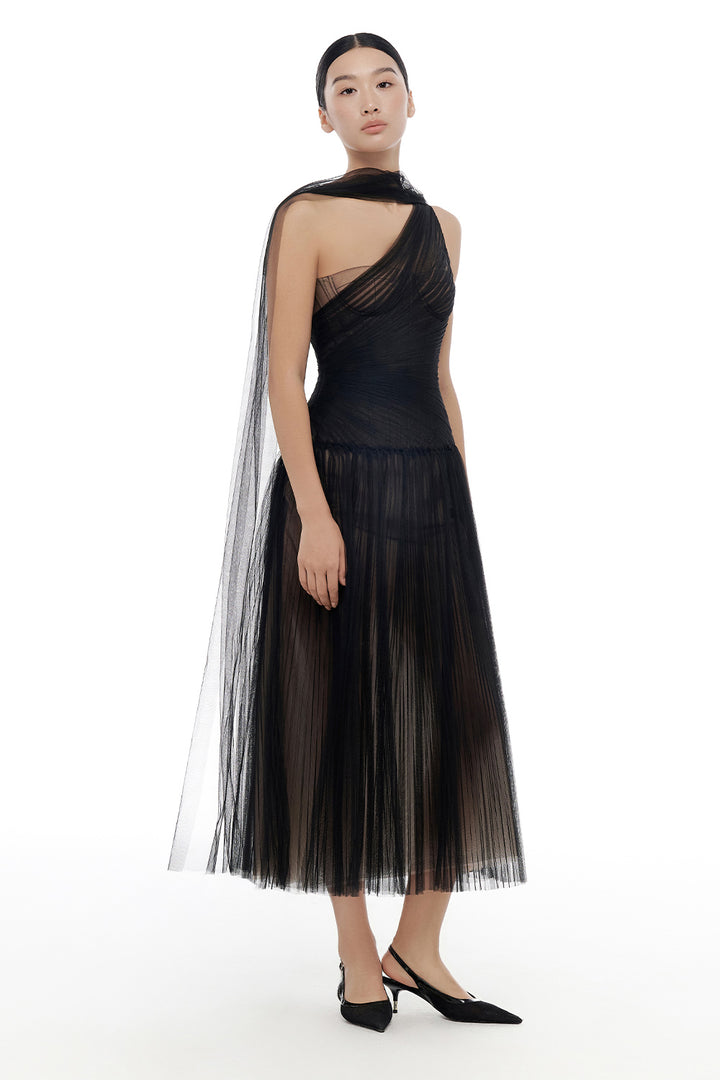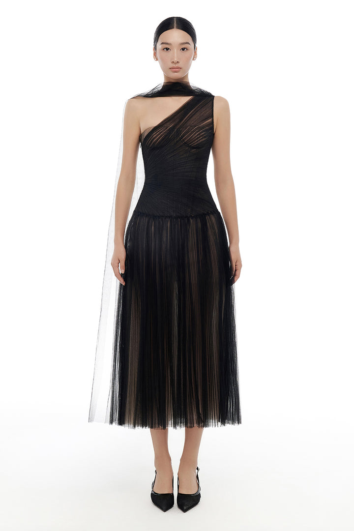| Special Features | Cinched waist with boning, Diagonal sheer effect covered the top, Long scarf neck , Gathered flare skirt, Side zipper |