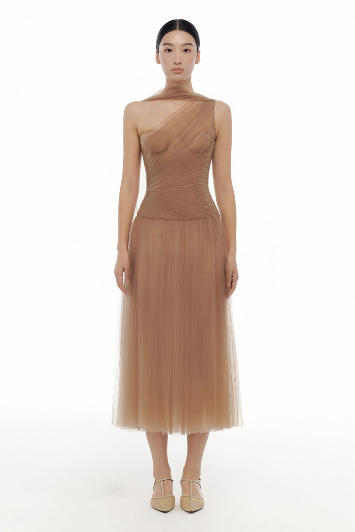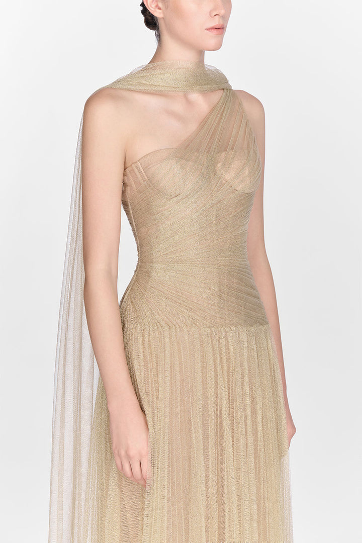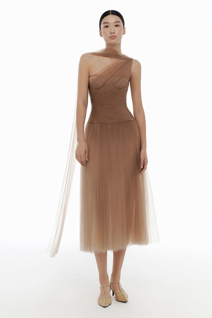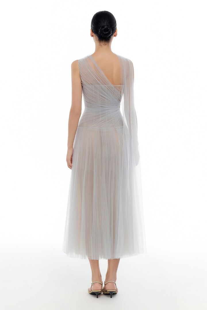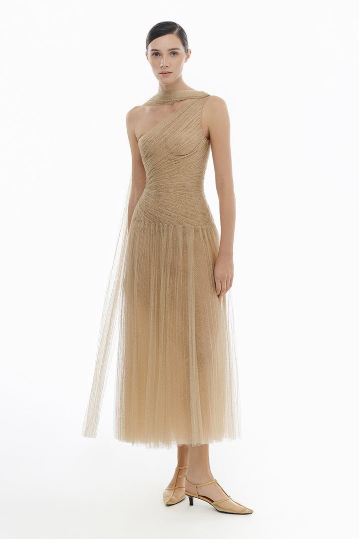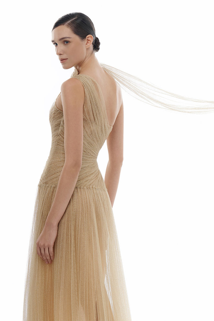 | Special Features | Cinched waist with boning, Diagonal sheer effect covered the top, Long scarf neck , Gathered flare skirt, Side zipper |