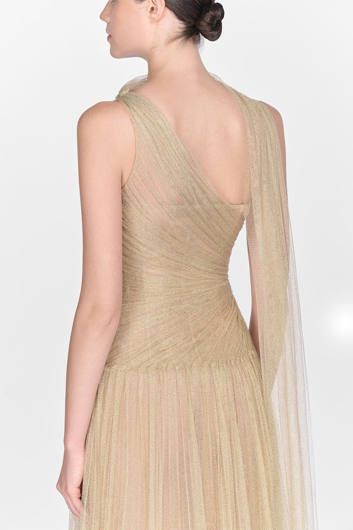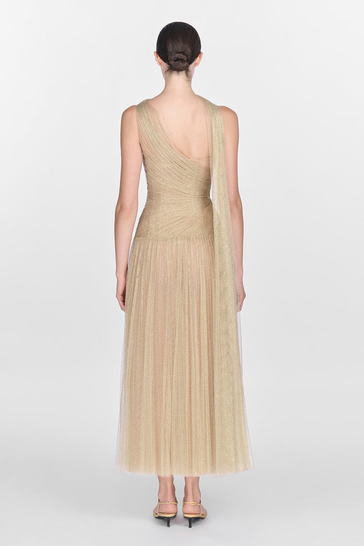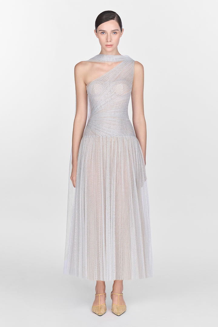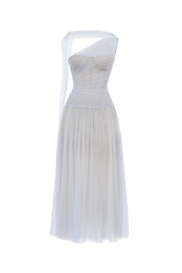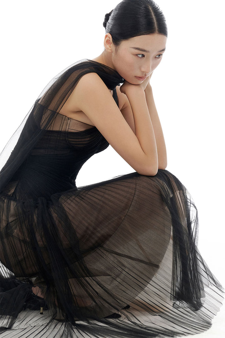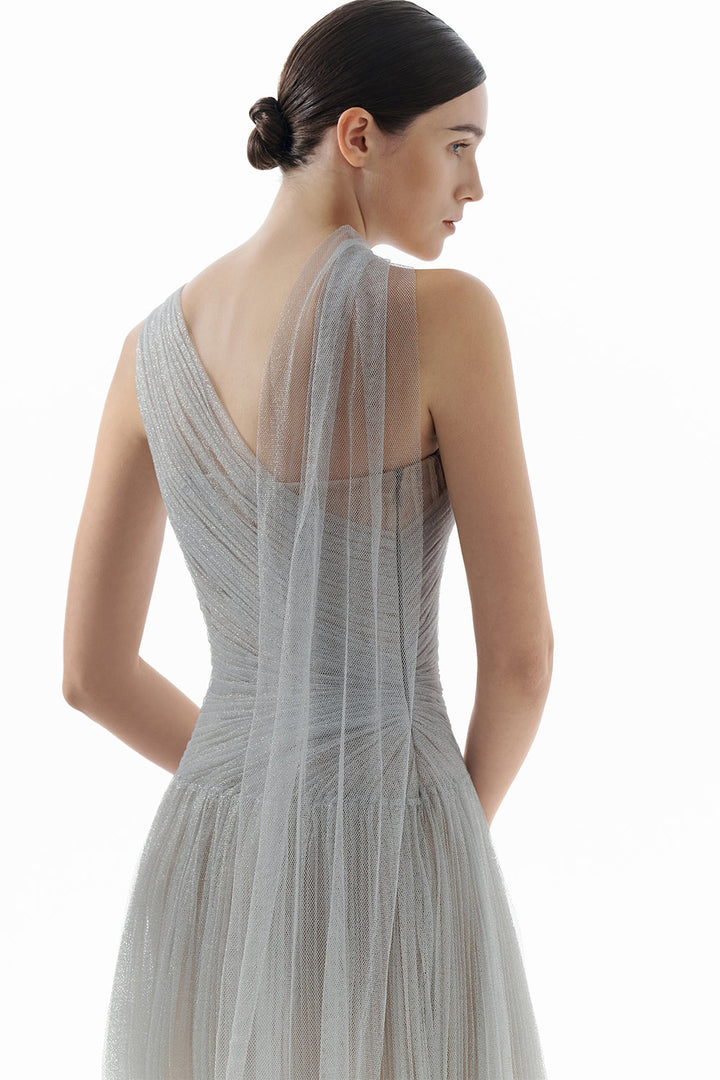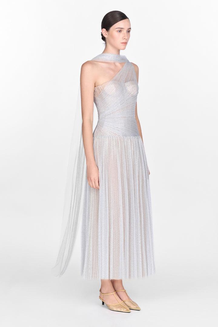 | Special Features | Cinched waist with boning, Diagonal sheer effect covered the top, Long scarf neck , Gathered flare skirt, Side zipper |