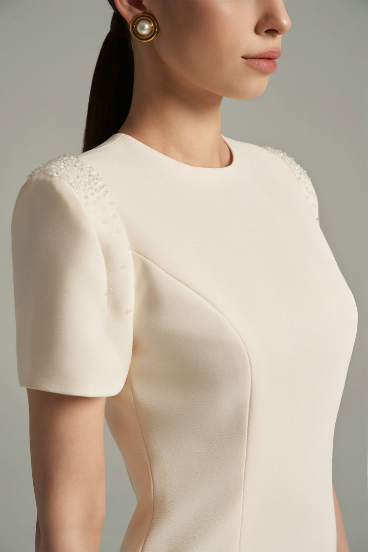 Crafted with precision and style, this dress is made to flatter your figure. The bodycon cut accentuates your curves while intricate bead detailing adds a touch of elegance. Made with scuba fabric, it provides a comfortable and flattering fit. Perfect for any occasion.