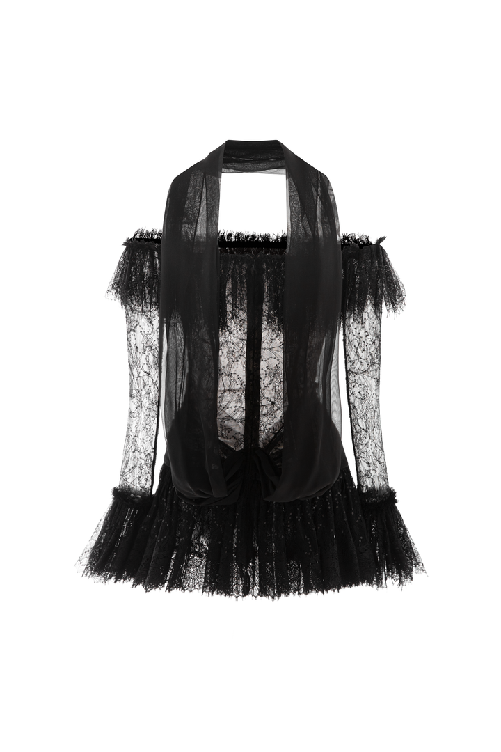 | Special Features | Gathered ruffle detail at the neck and bottom, Attached long flap at the back, Off-shoulder with ruffle cuffs |