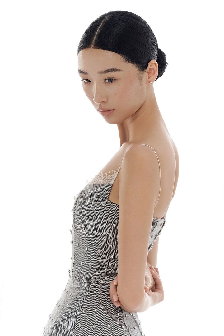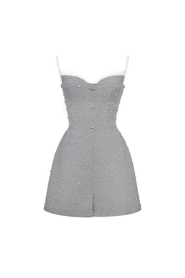 This grey herringbone crystal beaded dress is designed with an A-line silhouette and adorned with beautiful stone detailing. The unique combination of these features creates a stunning and sophisticated look, making it perfect for special occasions or formal events. Elevate your wardrobe with this elegant and timeless piece.