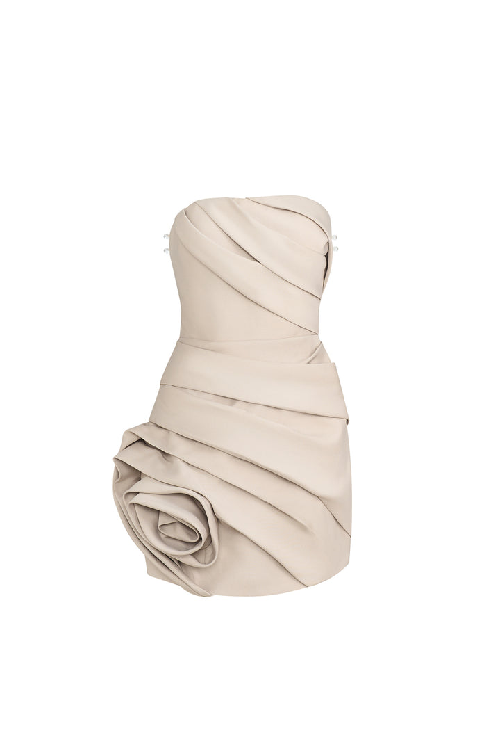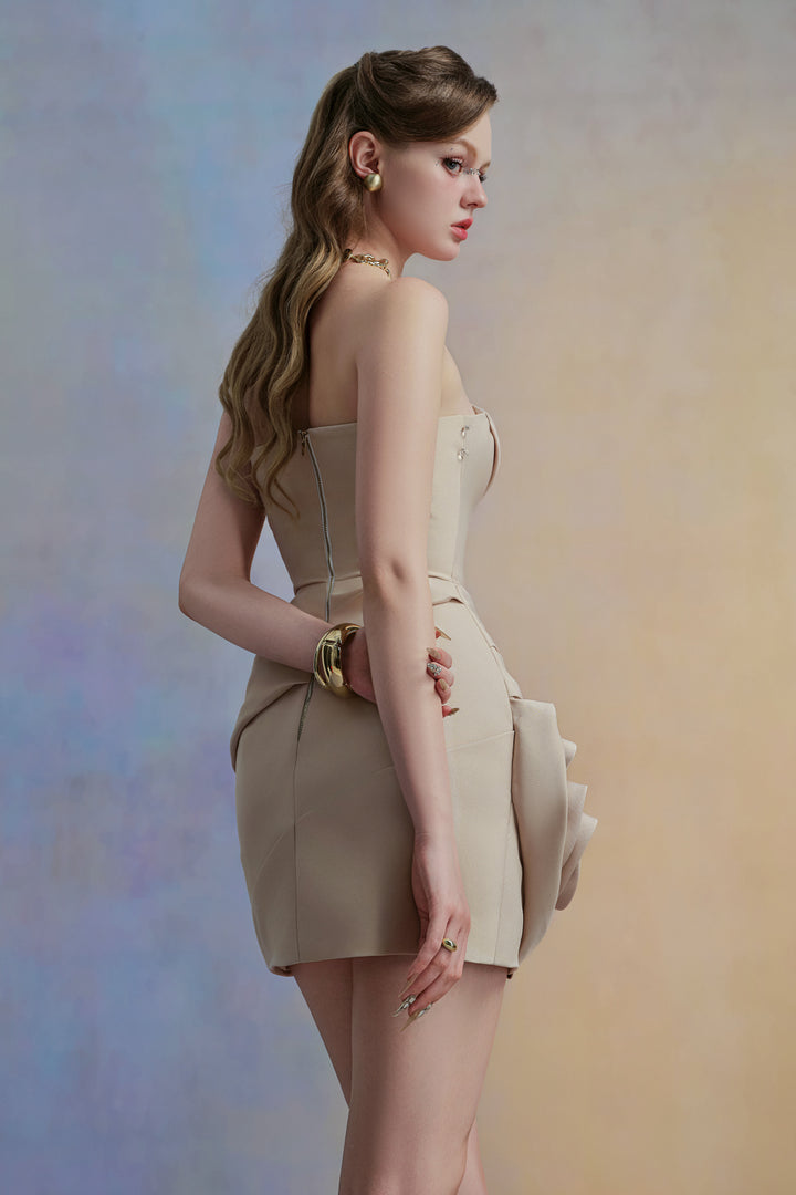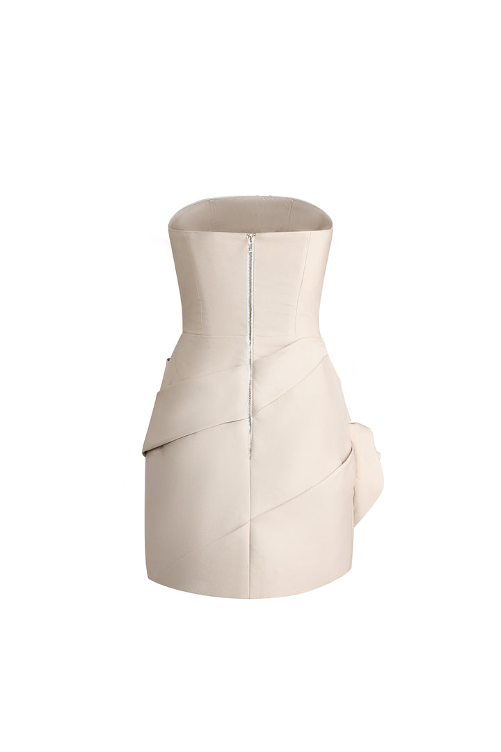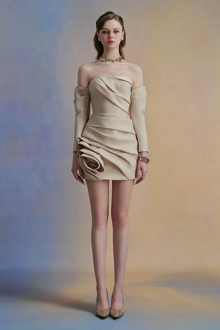 The mini dressshowcases a meticulously draped bodice that sculpts the figure with refined elegance. Made from high-quality taffeta, it delivers a polished sheen and structured silhouette. Its detachable sleeves offer customizable styling, enabling effortless transitions between a sophisticated long-sleeve look and a sleek strapless option. Ideal for upscale events, this dress balances classic craftsmanship with modern versatility.