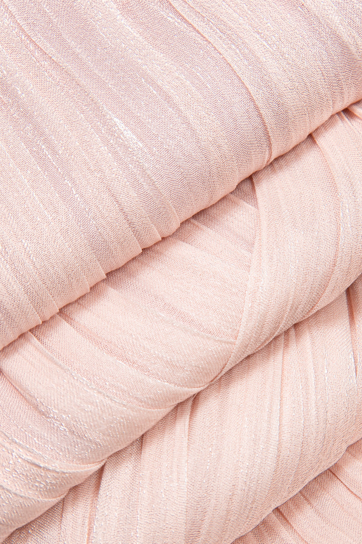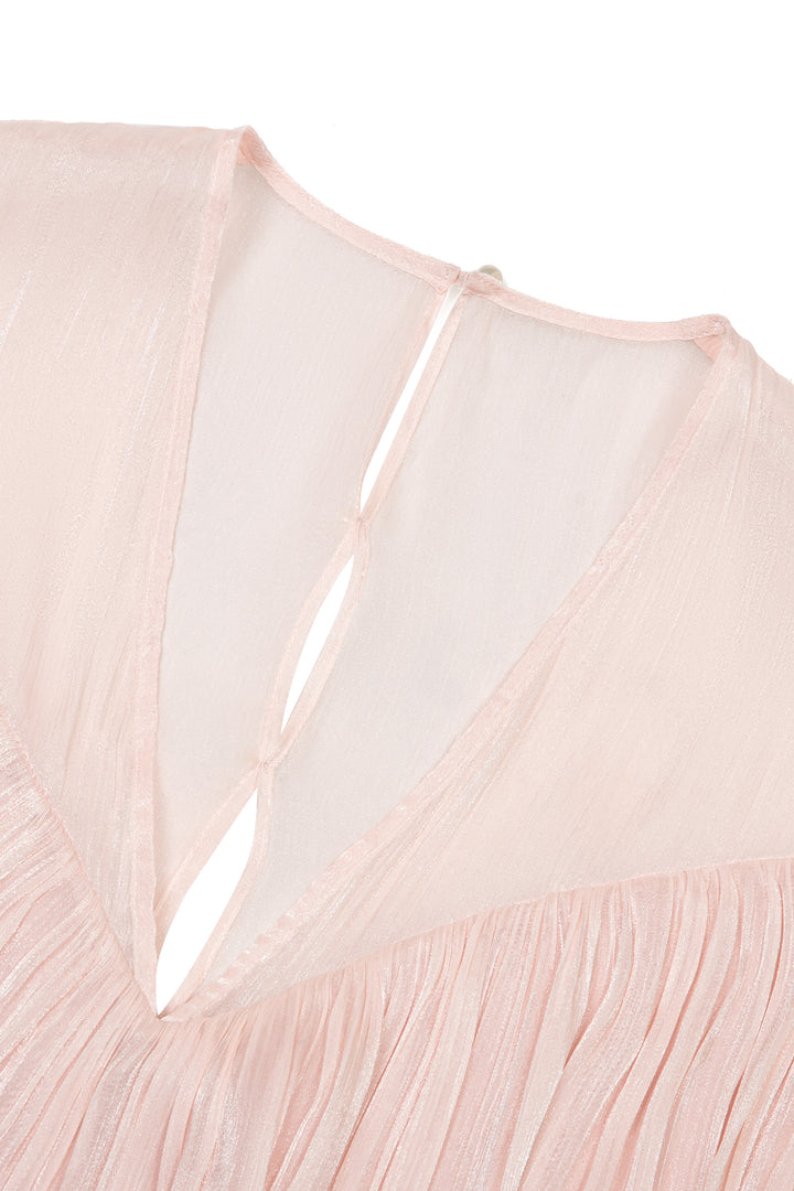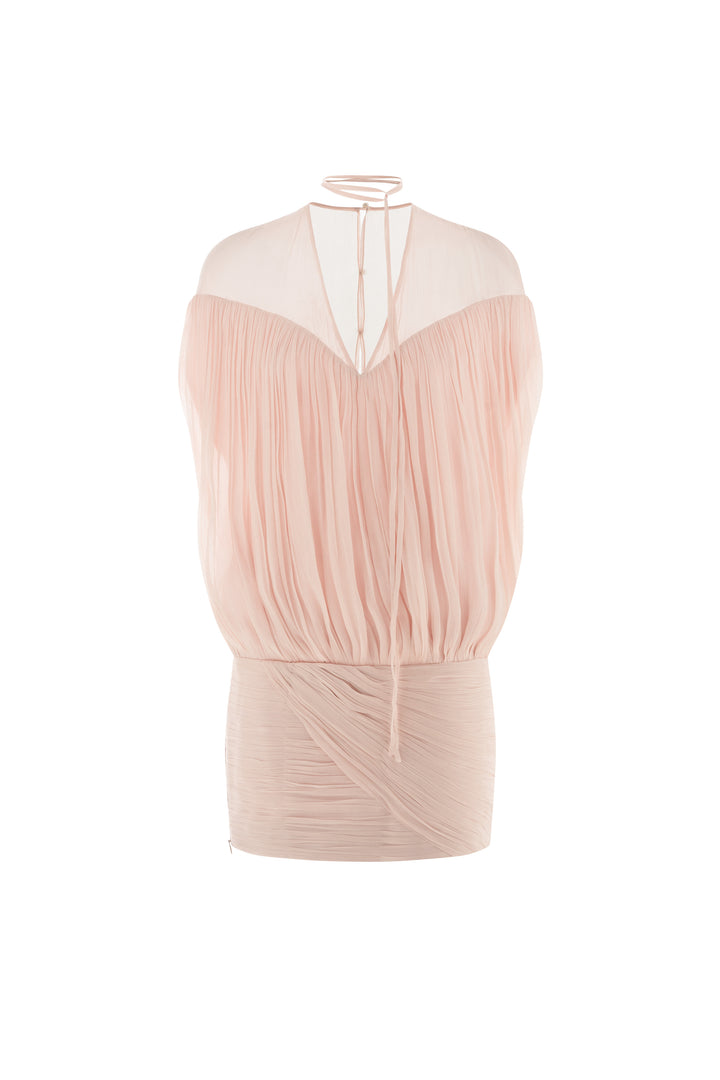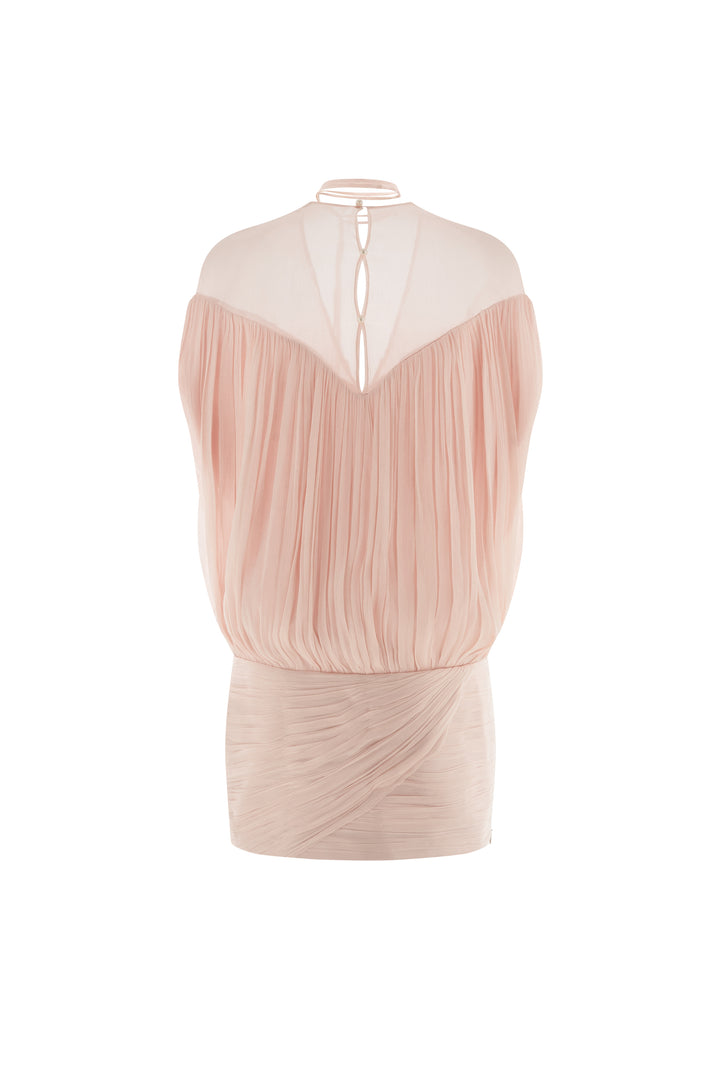 The mini dress features a sophisticated pleated ruched bodice that enhances the silhouette with textured elegance. Its cape shoulder design seamlessly transitions into batwing sleeves, creating a graceful, flowing effect that adds dimension and movement. Crafted from delicate organza, this mini dress combines structure with ethereal lightness, making it an expert choice for refined occasions.