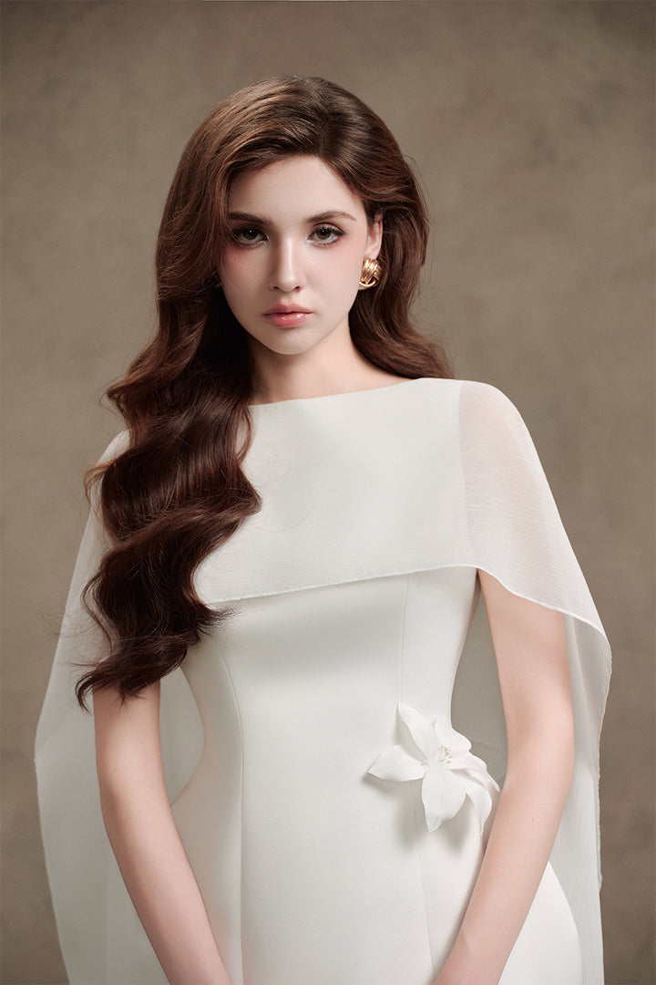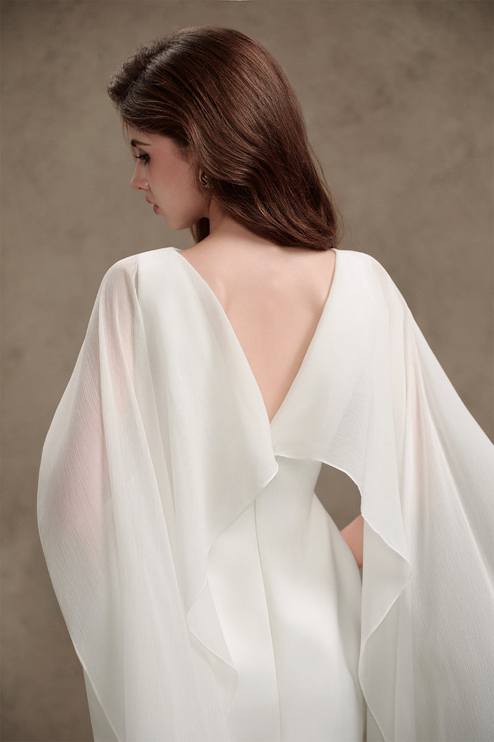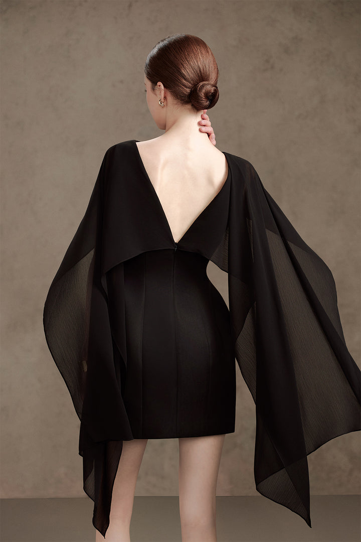 | Special Features | Cape shoulder with sheer flap, Waist dart, Open back, Detachable brooch |