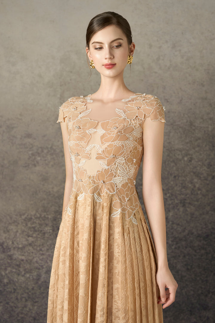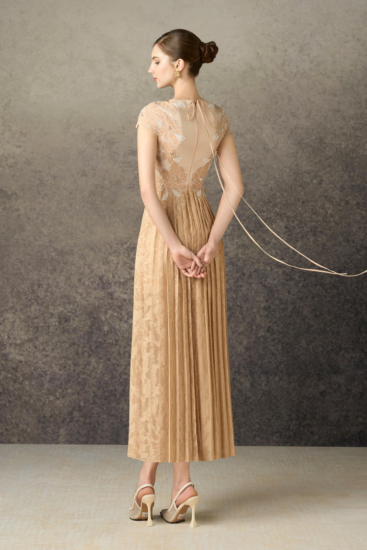 Elevate your wardrobe with the dress, featuring intricate embroidery that adds refined texture and elegance. The pleated flare skirt enhances movement and silhouette, creating a graceful, flowing effect. Crafted from luxurious silk lace, this dress combines expert tailoring with delicate details for a sophisticated, timeless look perfect for special occasions.