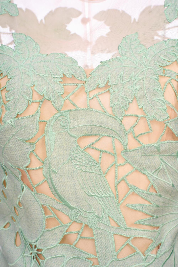 The dress features delicate embroidery of coconut trees, adding a subtle tropical elegance to its design. Crafted from smooth taffeta, this dress showcases an illusion neckline that enhances its sophisticated silhouette. Perfect for formal occasions, it combines refined craftsmanship with a modern aesthetic for a standout look.