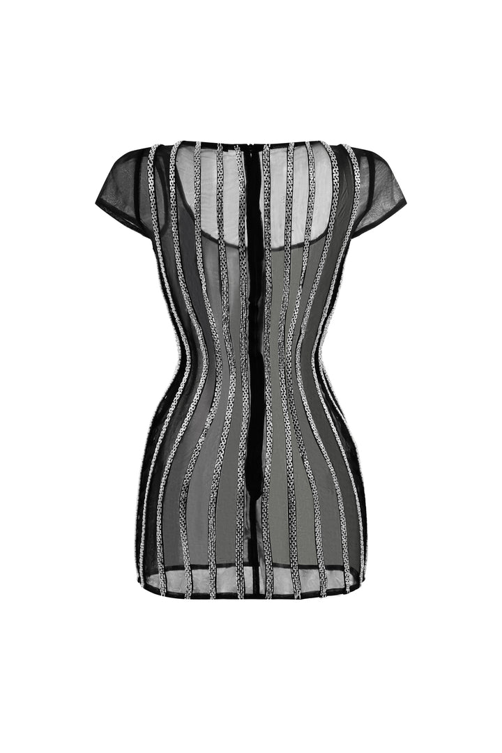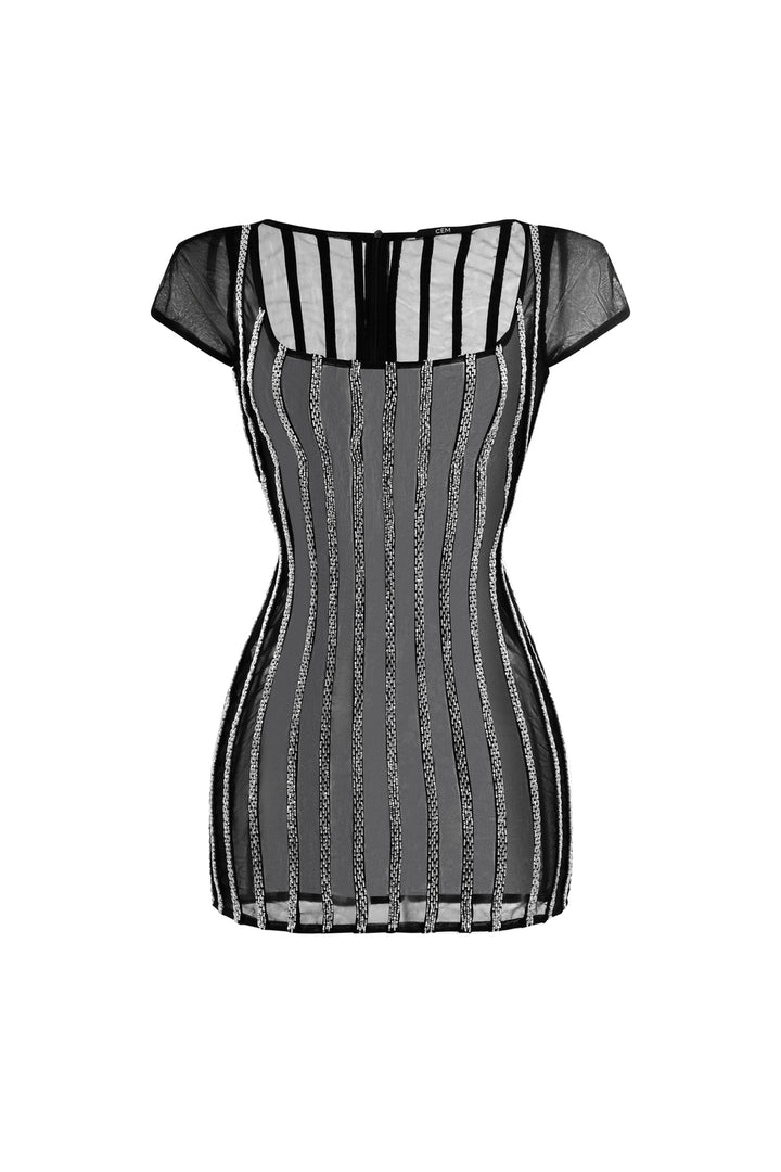 The mini dress features a flattering scoop neckline and delicate bead-striped detailing that adds subtle texture and elegance. Crafted from sheer chiffon fabric, this dress offers a lightweight, see-through effect that enhances its sophisticated, modern appeal. Perfect for evening events, it combines a body-hugging silhouette with refined embellishments for a confident, stylish look.