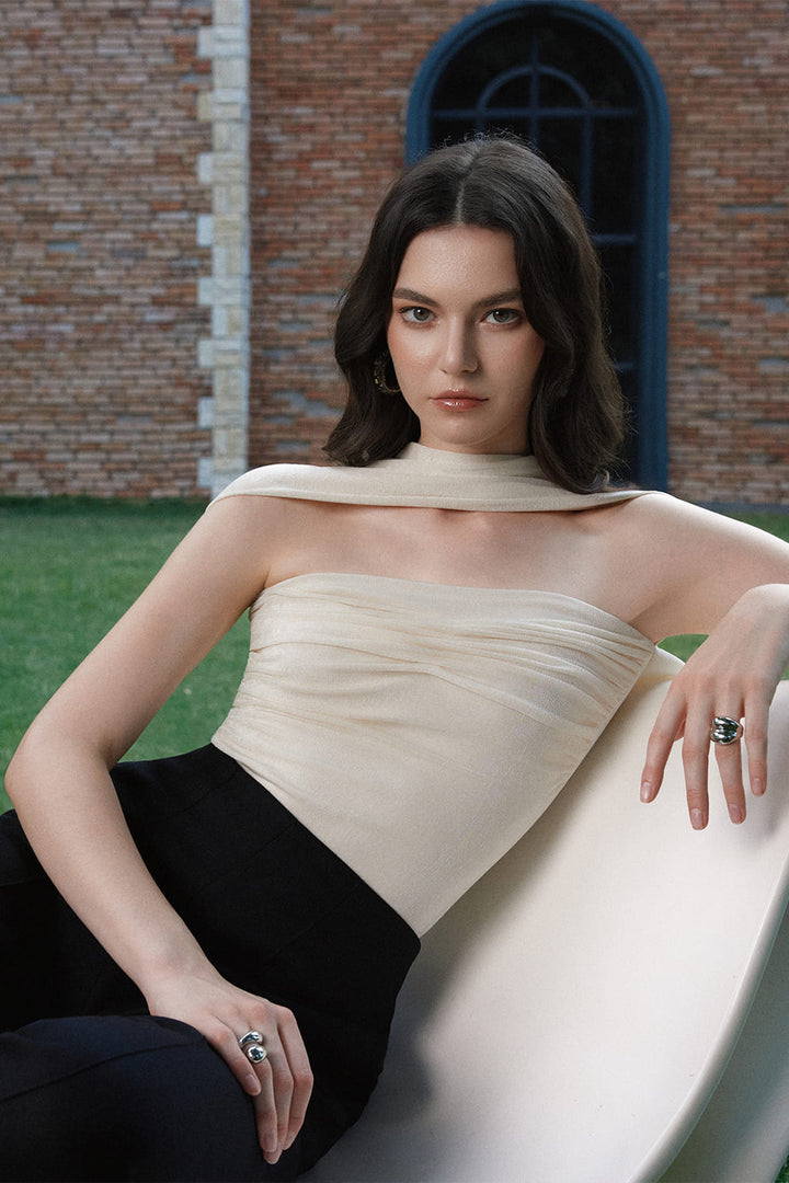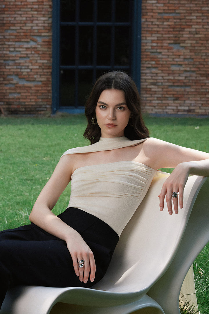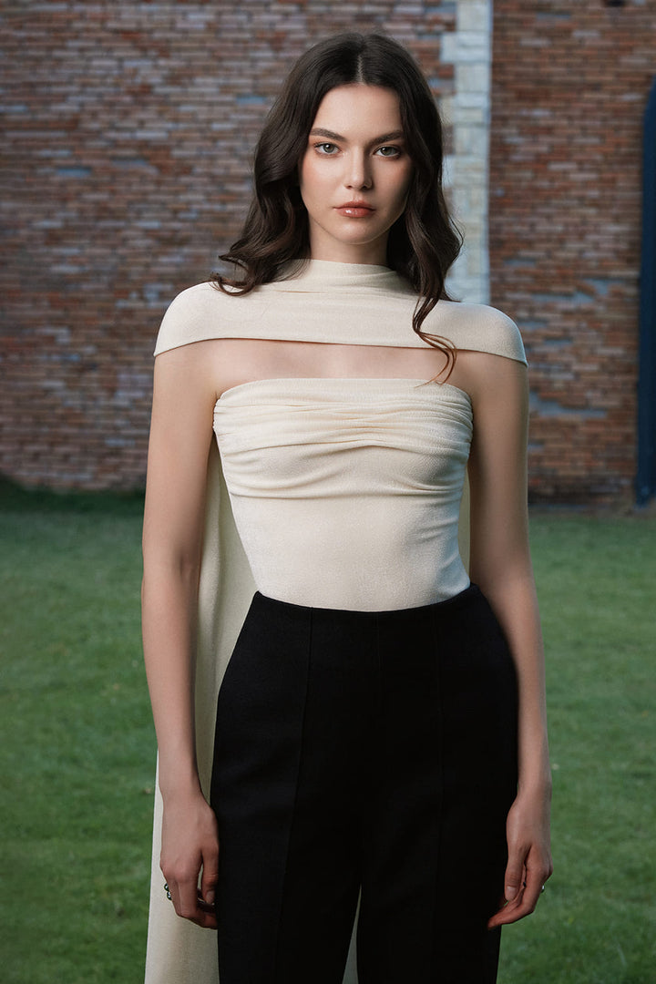 This expertly crafted bodycon top features distinctive cape shoulders for a sophisticated silhouette. Made from a premium cotton-spandex blend, the design offers both structure and stretch, ensuring a flattering fit that moves with your body while maintaining its shape throughout the day. Perfect for elevating both professional and evening ensembles.