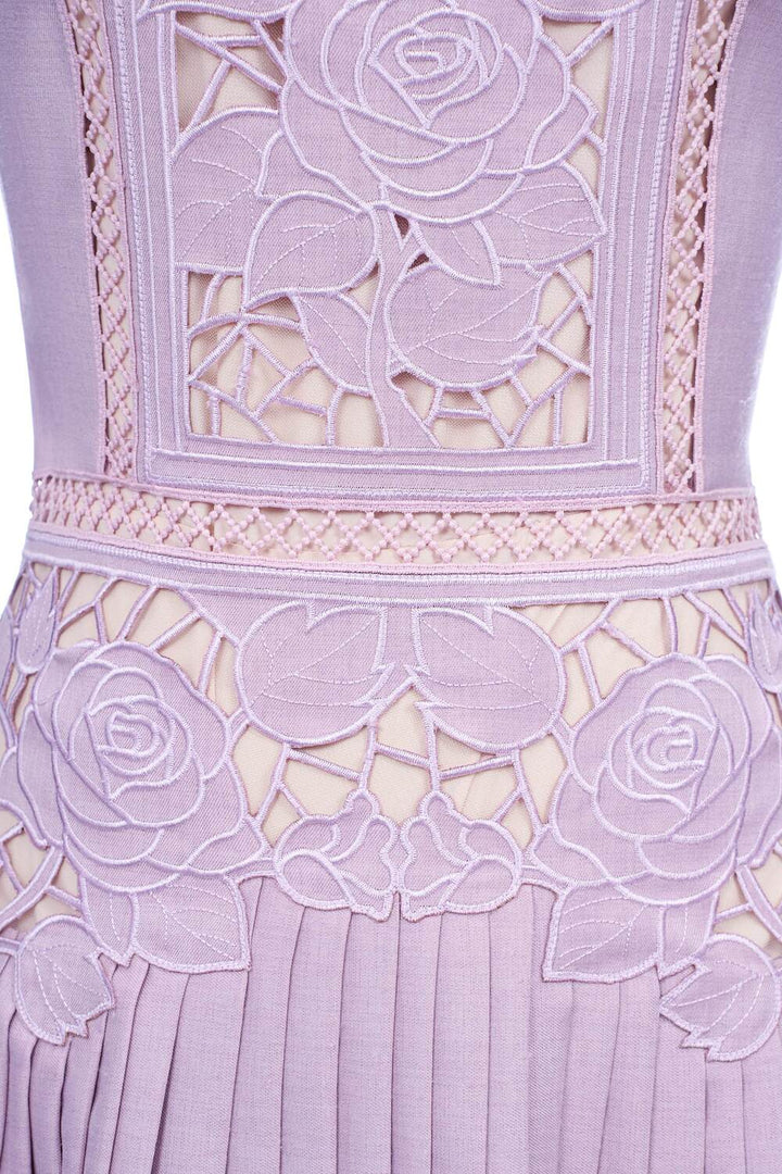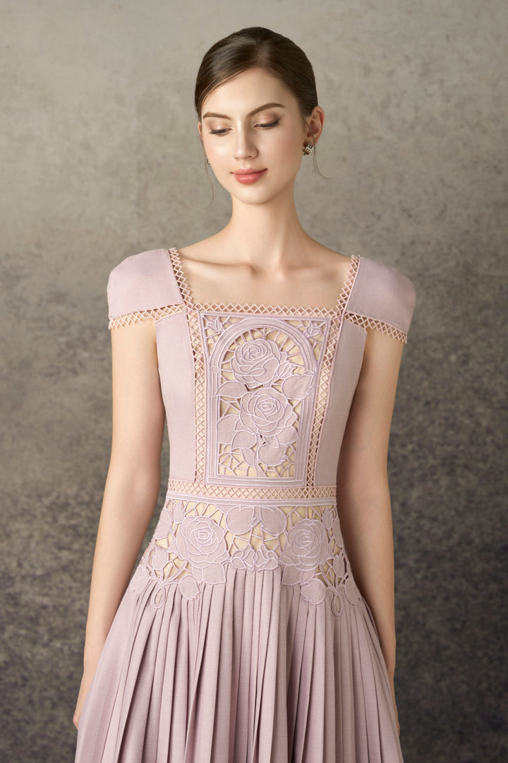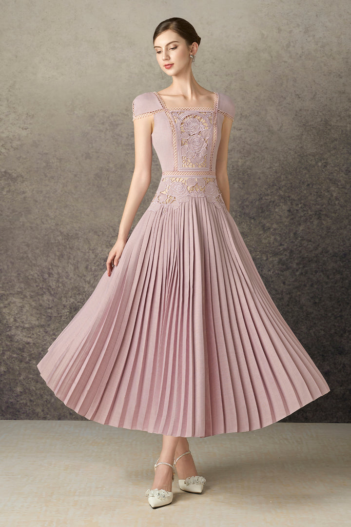 This dress features a flared pleated skirt that adds graceful movement and volume. Crafted from breathable polycotton, it offers comfort and durability. The square neckline enhances its elegant silhouette, while delicate embroidery details provide a refined, artisanal touch. Falling to calf length, this dress balances classic style with modern sophistication, making it a versatile choice for both casual and formal occasions.