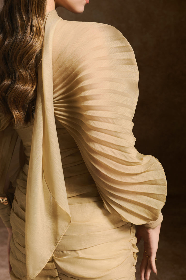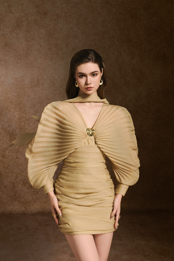 The mini dress features elegant batwing pleated sleeves that add a dramatic flair, perfectly balanced by a gathered bodice that enhances the silhouette. Crafted for a flattering fit, this dress combines structured detailing with soft muslin fabric, making it an ideal choice for sophisticated occasions where style and comfort are paramount.
