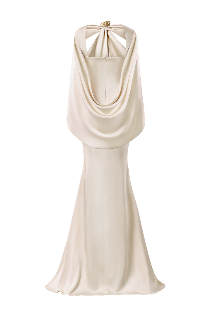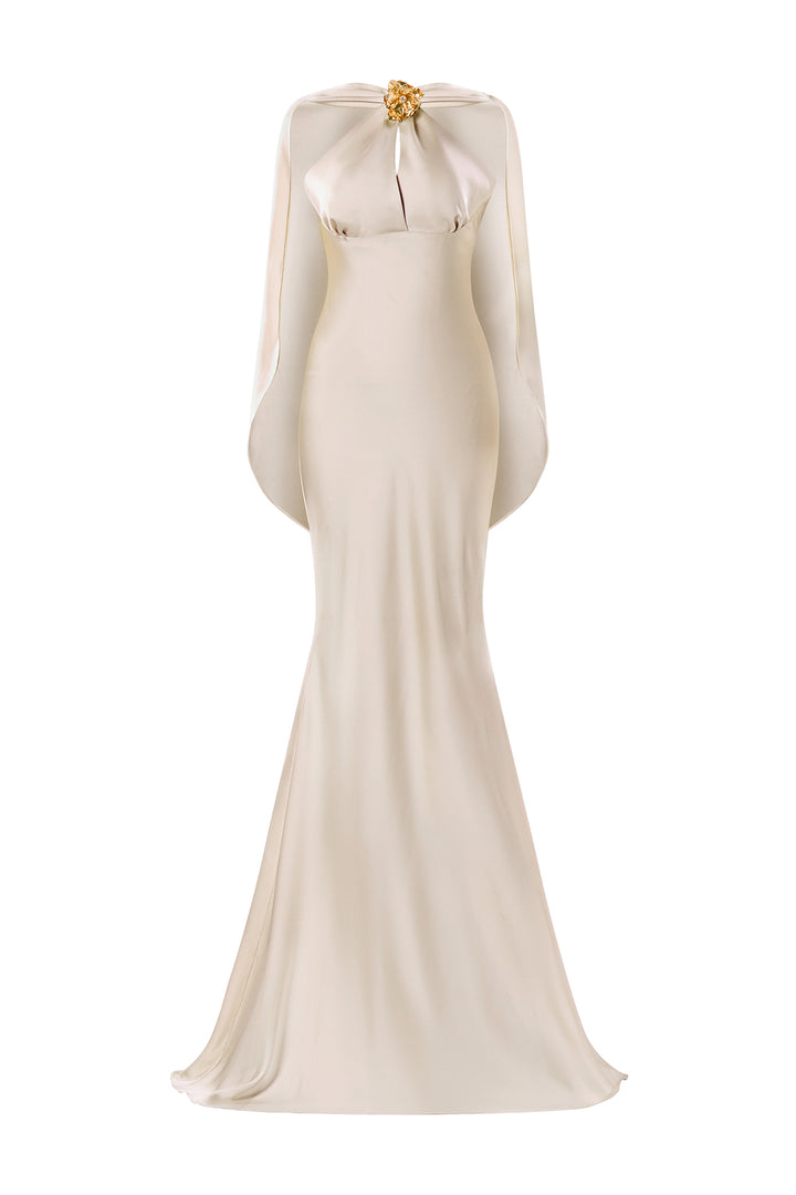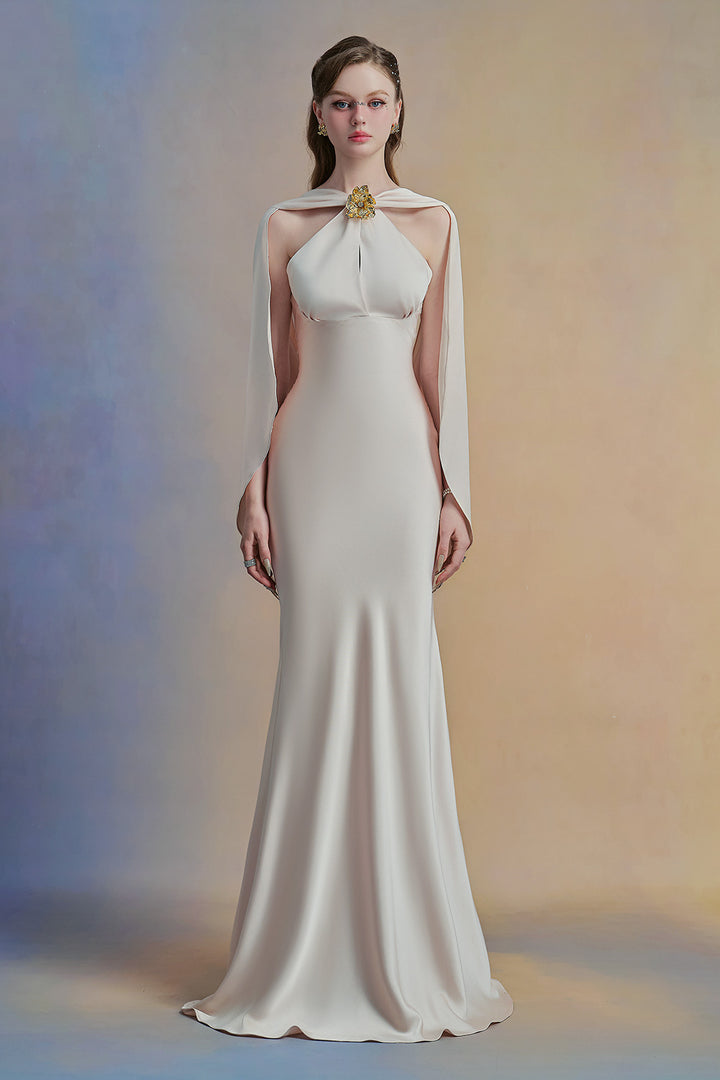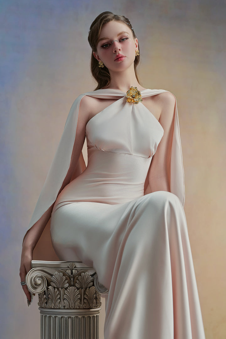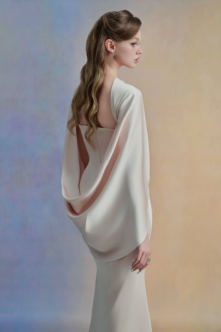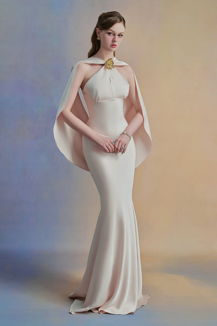 This dress combines elegance with a striking silhouette. Crafted from smooth satin, it features a mermaid cut that accentuates the figure, flowing seamlessly into a floor-length hem. The distinctive cape shoulder design adds a sophisticated, fashion-forward touch, perfect for formal occasions where refined style is essential.
