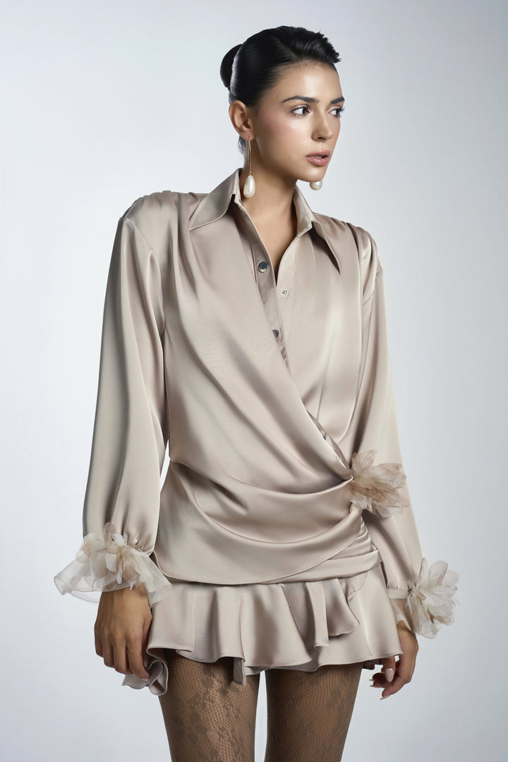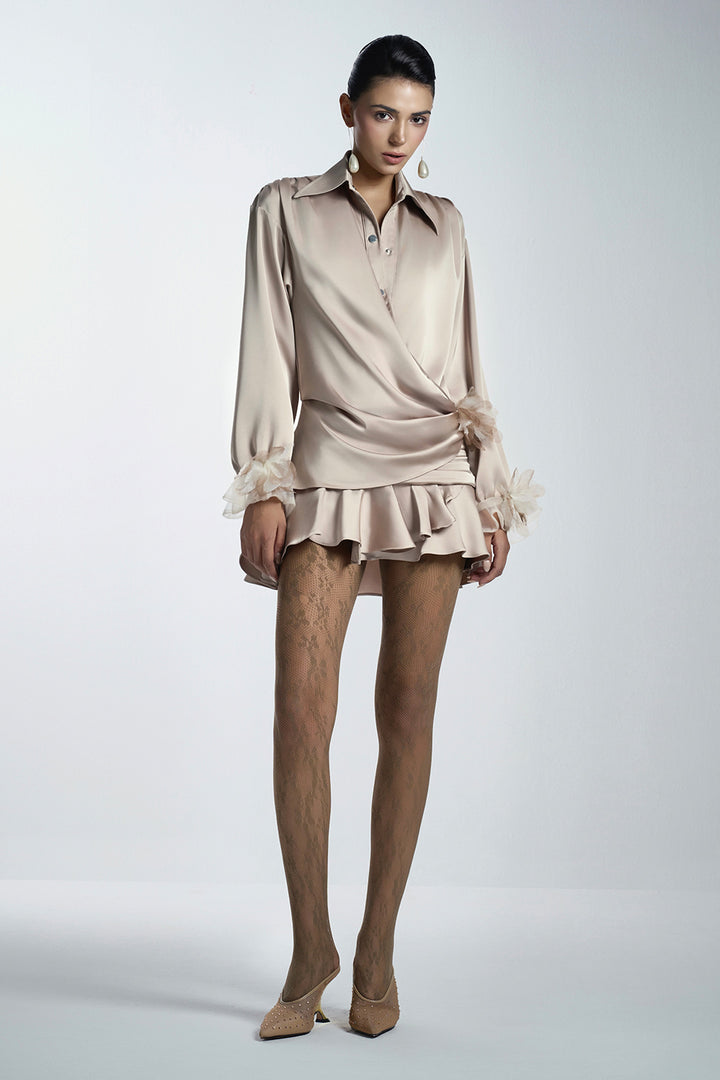 Elevate your wardrobe with the dress, expertly crafted for a refined silhouette. The drop waist design enhances proportion while the crossover neckline adds a sophisticated touch. Made from luxurious silk, this mini dress offers a smooth, comfortable fit that moves effortlessly with you. Ideal for both day and evening wear, it combines timeless elegance with modern style.