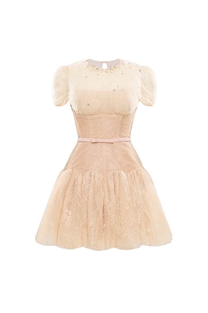 Turn heads in the dress, where charming puffy sleeves meet delicate Chantilly lace for a fun, flirty vibe. The playful silhouette is perfect for dancing the night away or stealing the spotlight at any event with a fresh, whimsical flair.