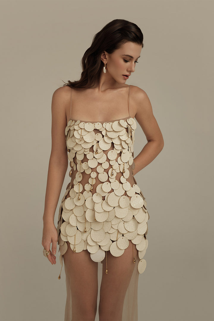 | Special Features | See-through design, Attached circular leather details, Embellished with tear gold beads, Sheer effect, Open back with tie string |